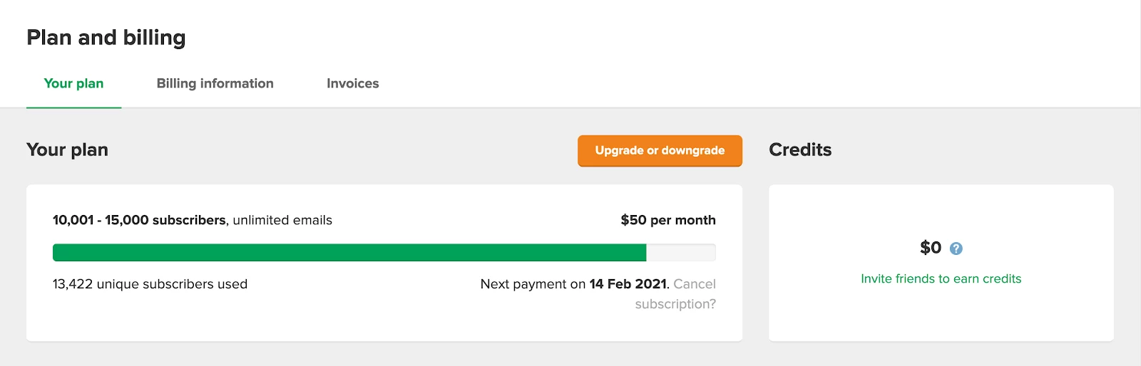 Here, you can see your current plan, how many unique subscribers you’ve used, and when the next payment will take place. This number is updated every day.