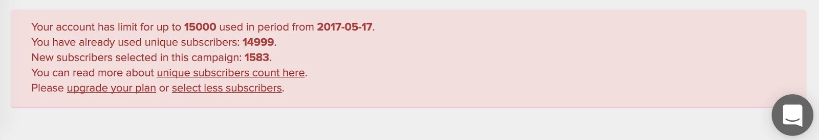 When you reach your plan’s subscriber limit, you will be notified with a red banner on the Plan and billing or Recipients page of a new campaign.