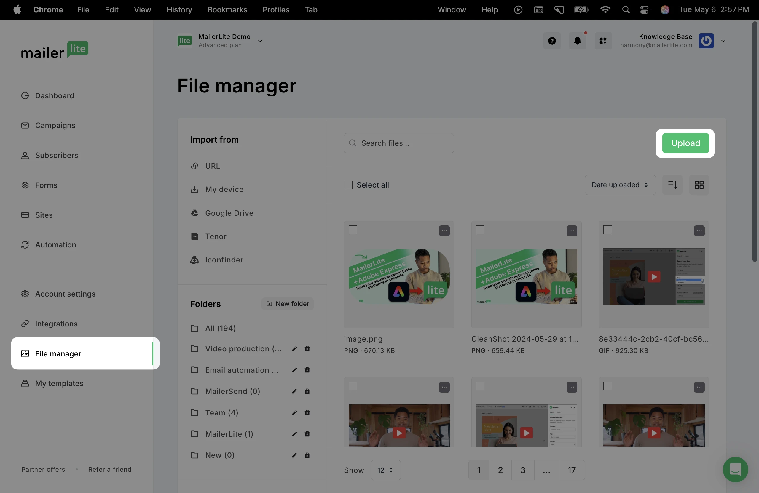 Choose Upload to import the file directly from your device or choose the File manager option to select a file that is already in your account.