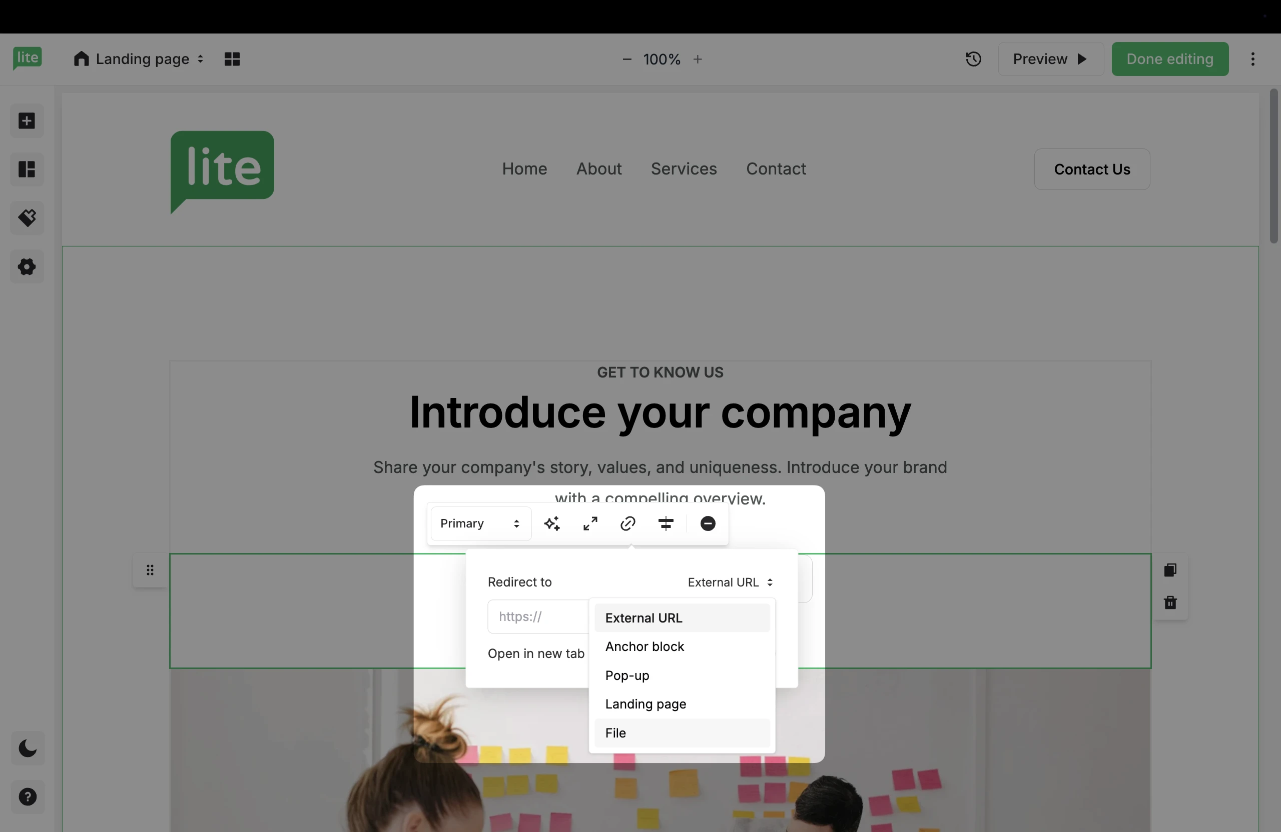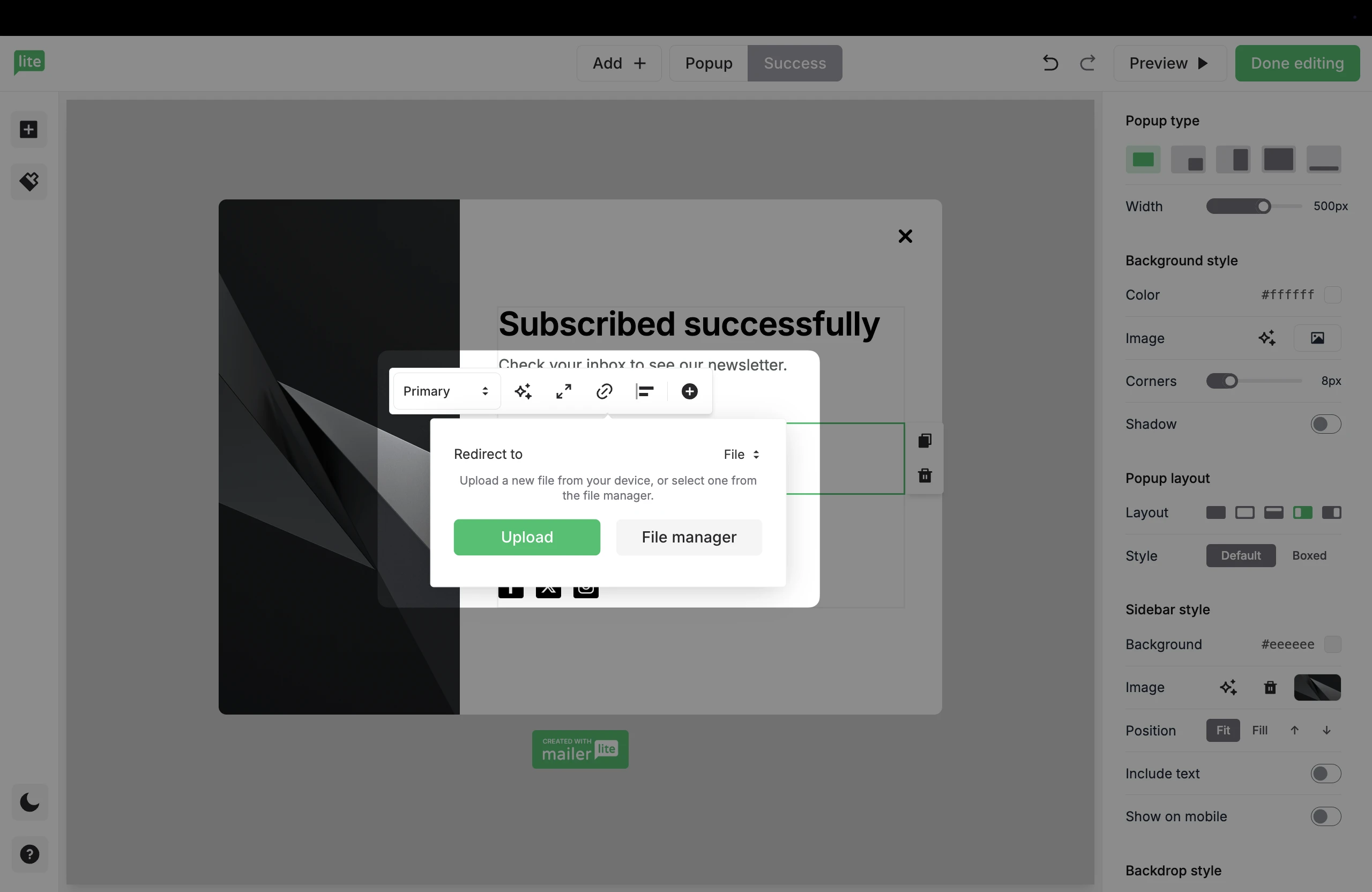 Similarly, you can hyperlink a file to a bit of text, or to a button within a MailerLite pop-up form. This can be done both on the main form, and the Success page.