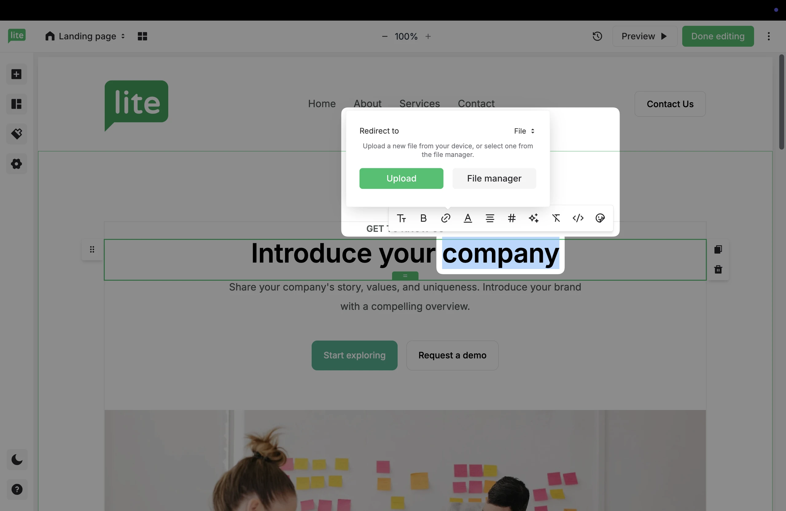 Highlight the piece of text that you want to hyperlink, and a menu will appear above it. Click the URL icon and choose Insert file.
