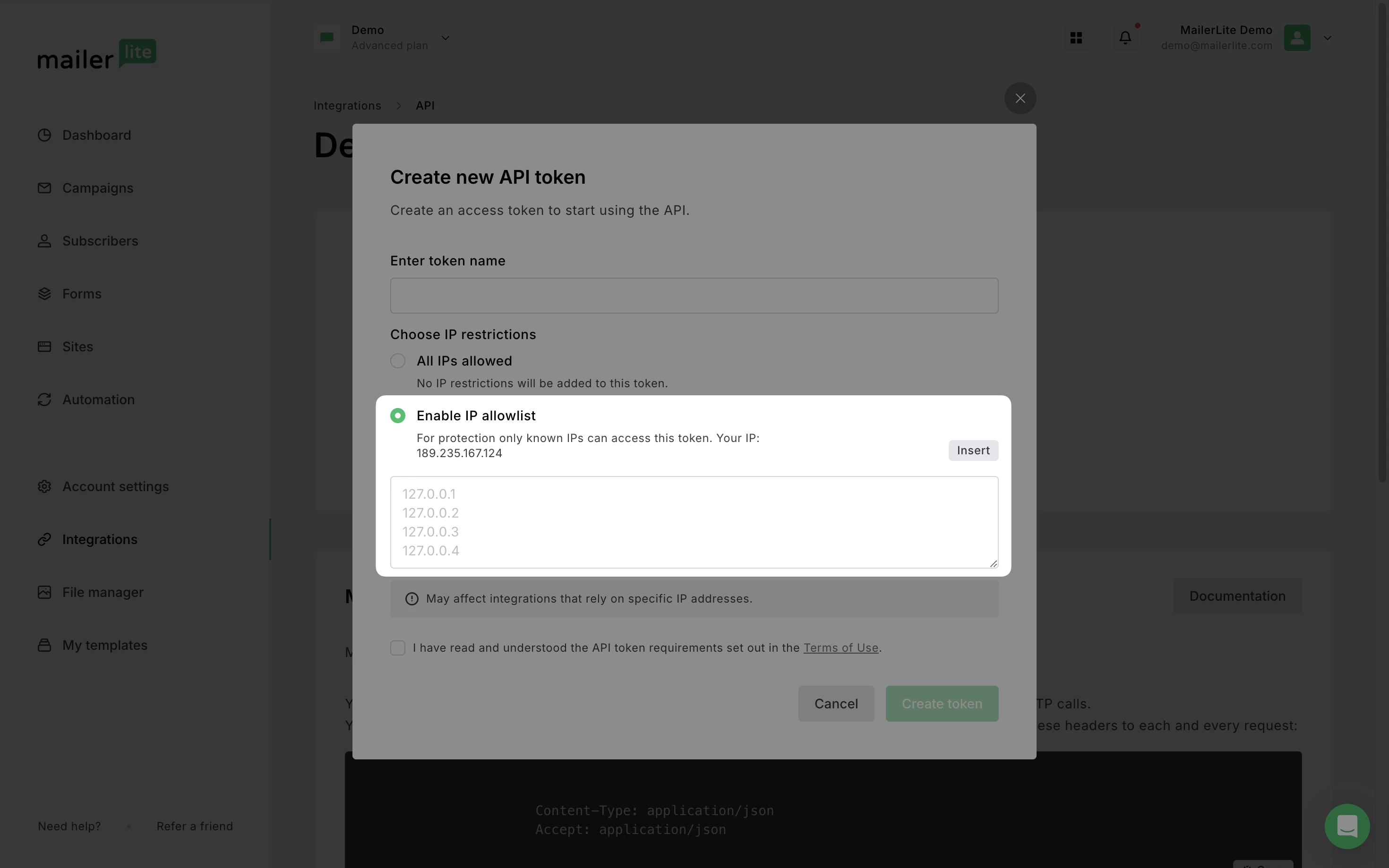 When creating an API token in MailerLite, you can specify which IP addresses can access the API key. Use our IP Allowlist feature to create a list of trusted IP addresses to be sure that only requests coming from these specified IP addresses will be accepted, adding an additional layer of security.