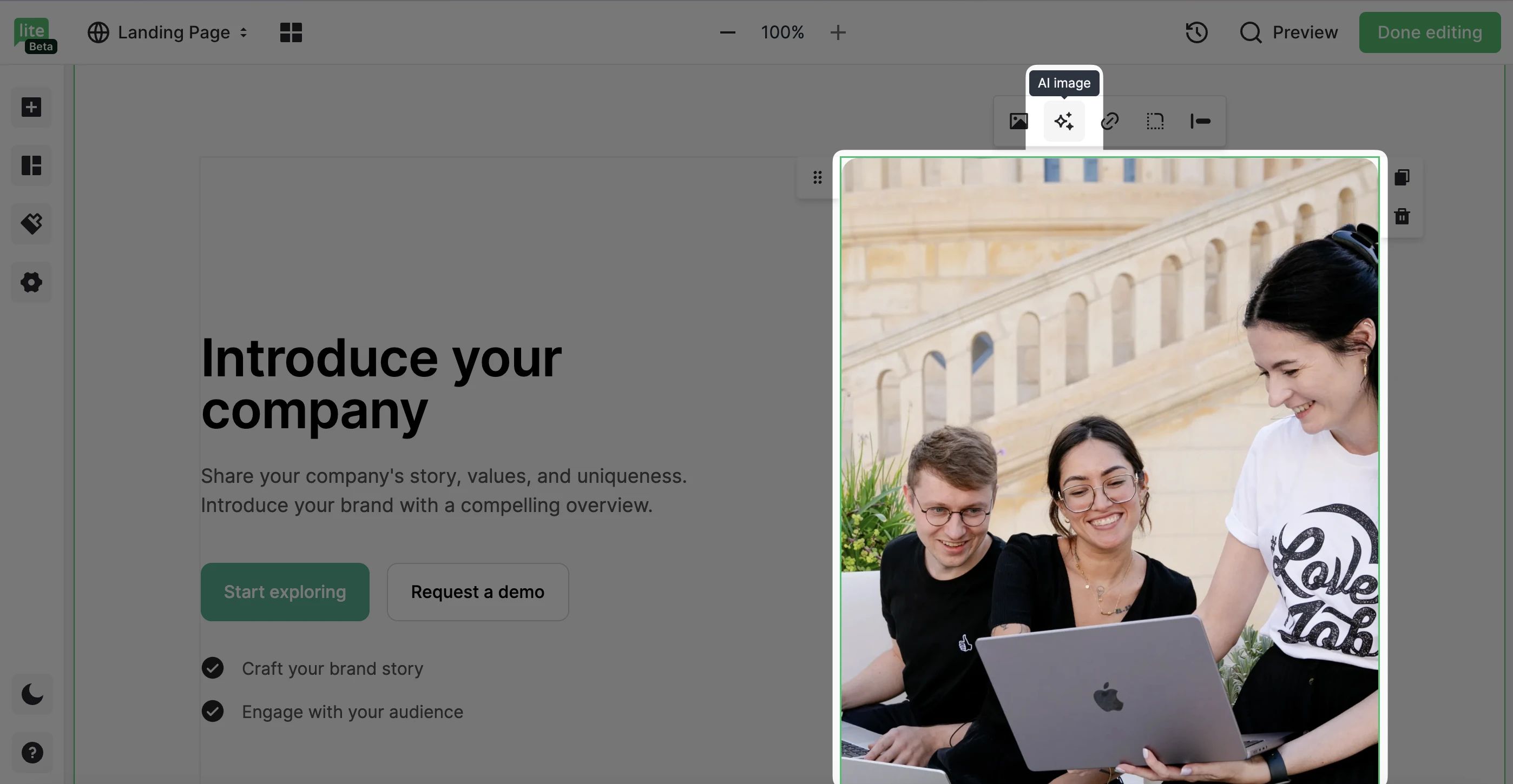 Those on the Advanced plan can experience the power of AI image and text generation while building landing pages.