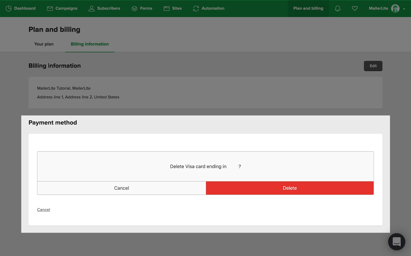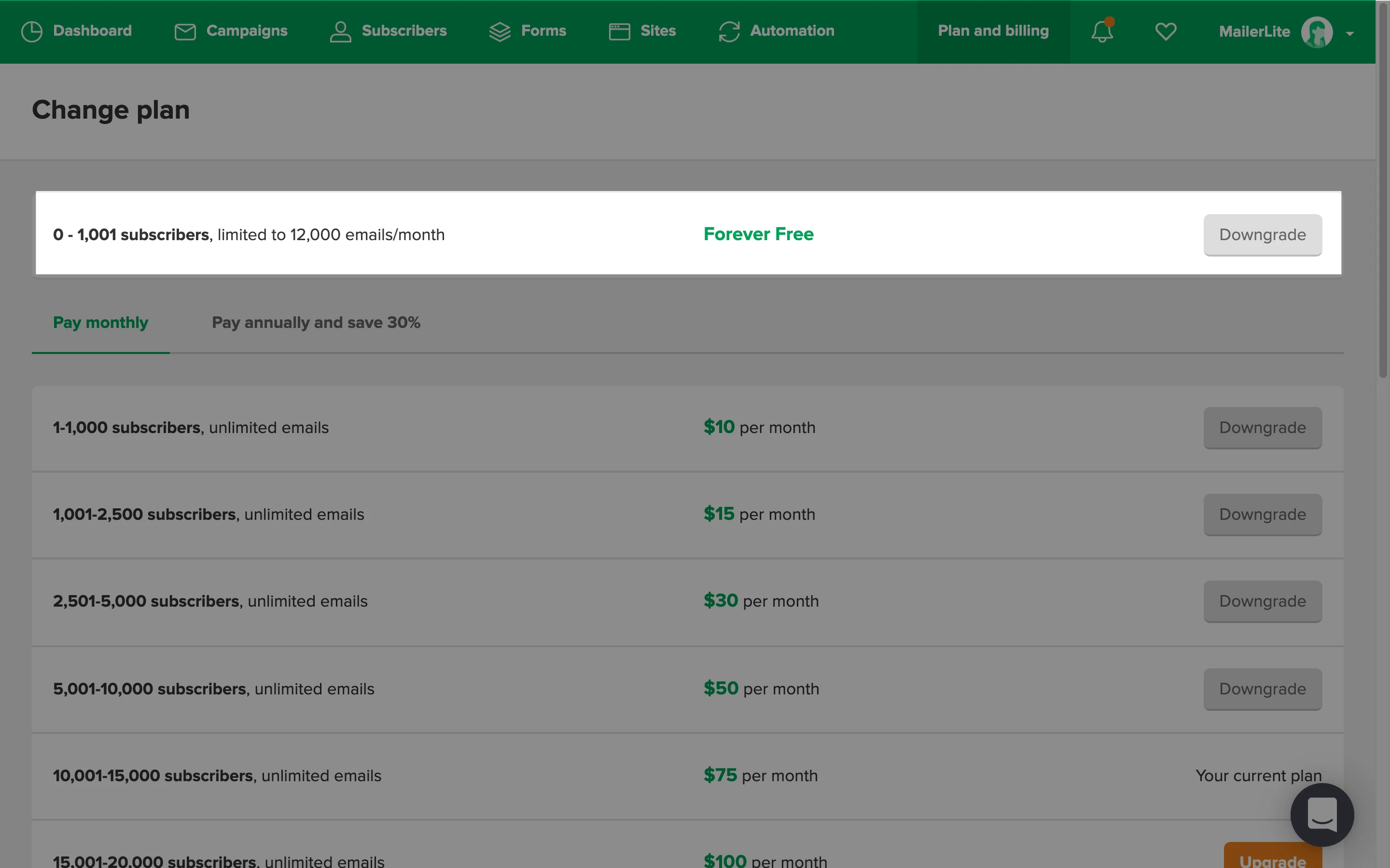 Keep in mind that the Free plan has a limit of 500 active subscribers. This means that once the account is downgraded to Free, you will need to keep the active subscriber limit under 500 to ensure the downgrade is successful.