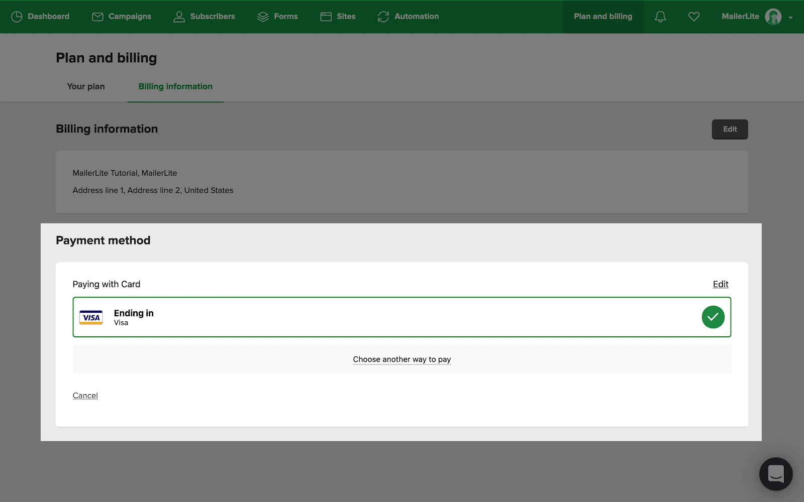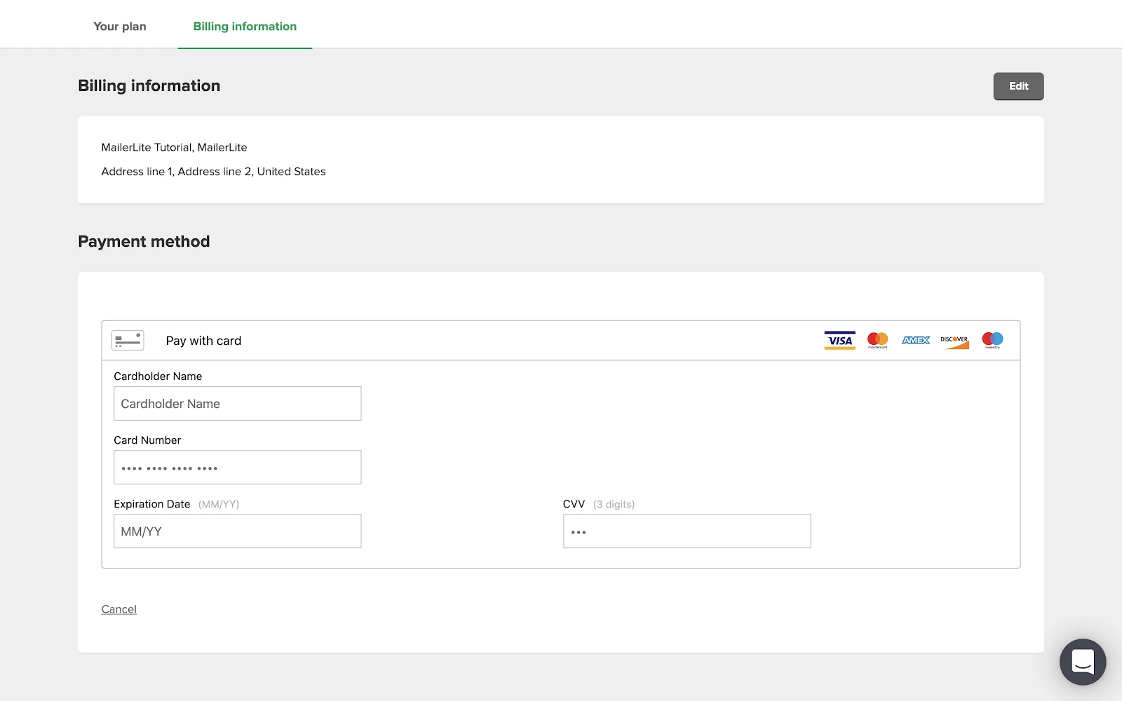 If MailerLite detects that you have previously entered and saved payment information, an AutoFill Link will appear during checkout to help avoid re-entering your credit card details.