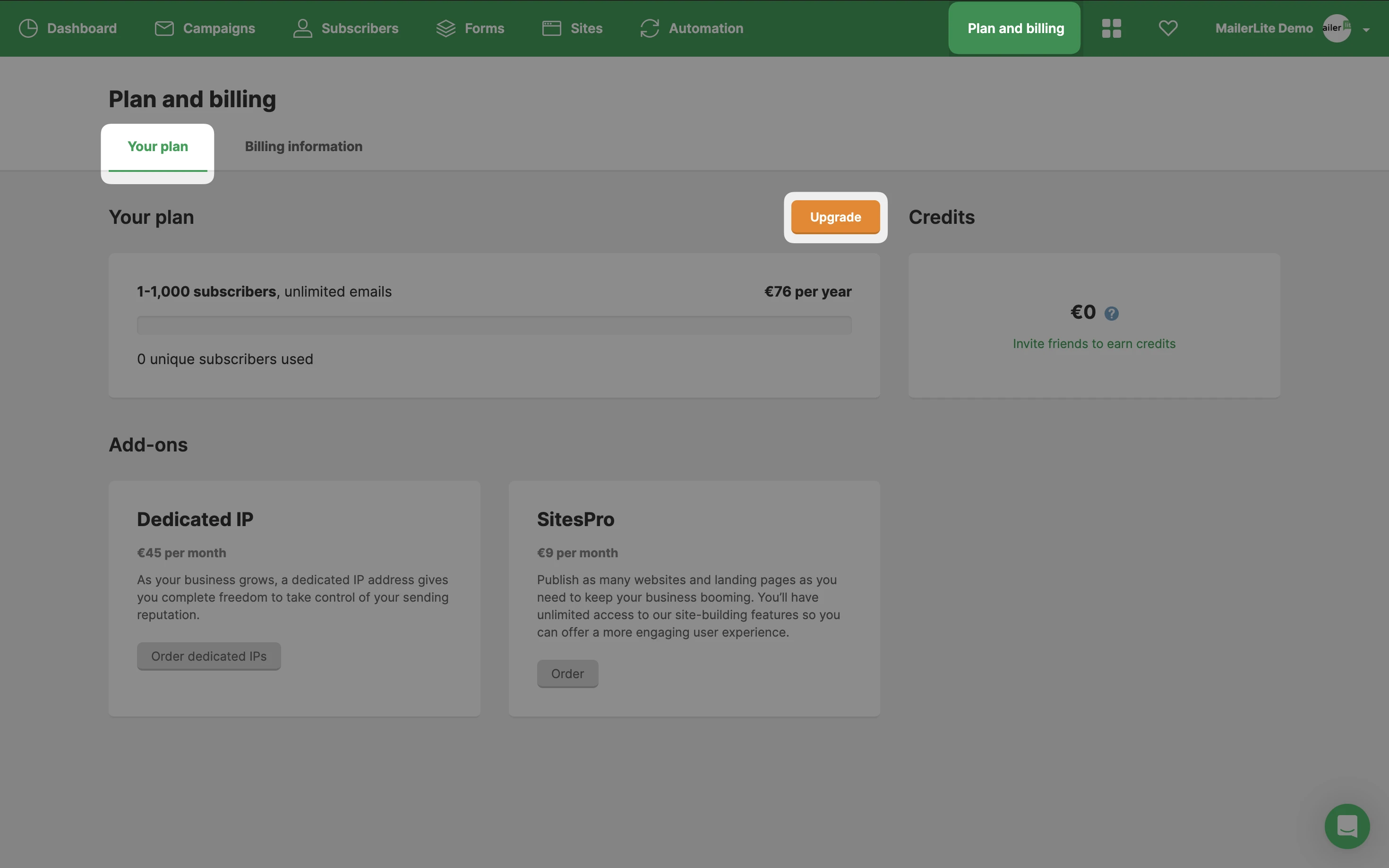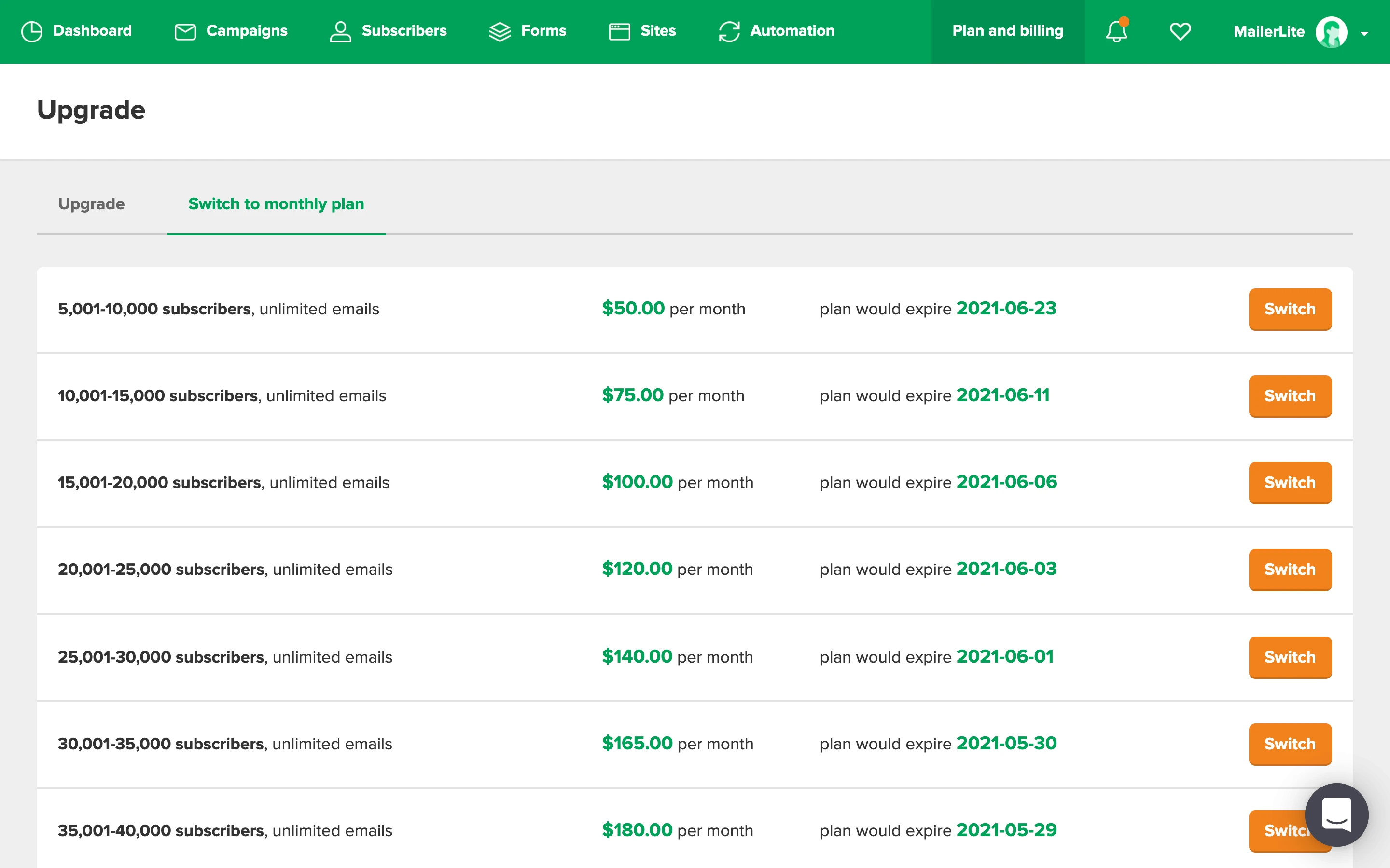 MailerLite has four types of plans: Free, Growing business, Advanced, and Enterprise. You can compare the features between these plans on the Pricing page.