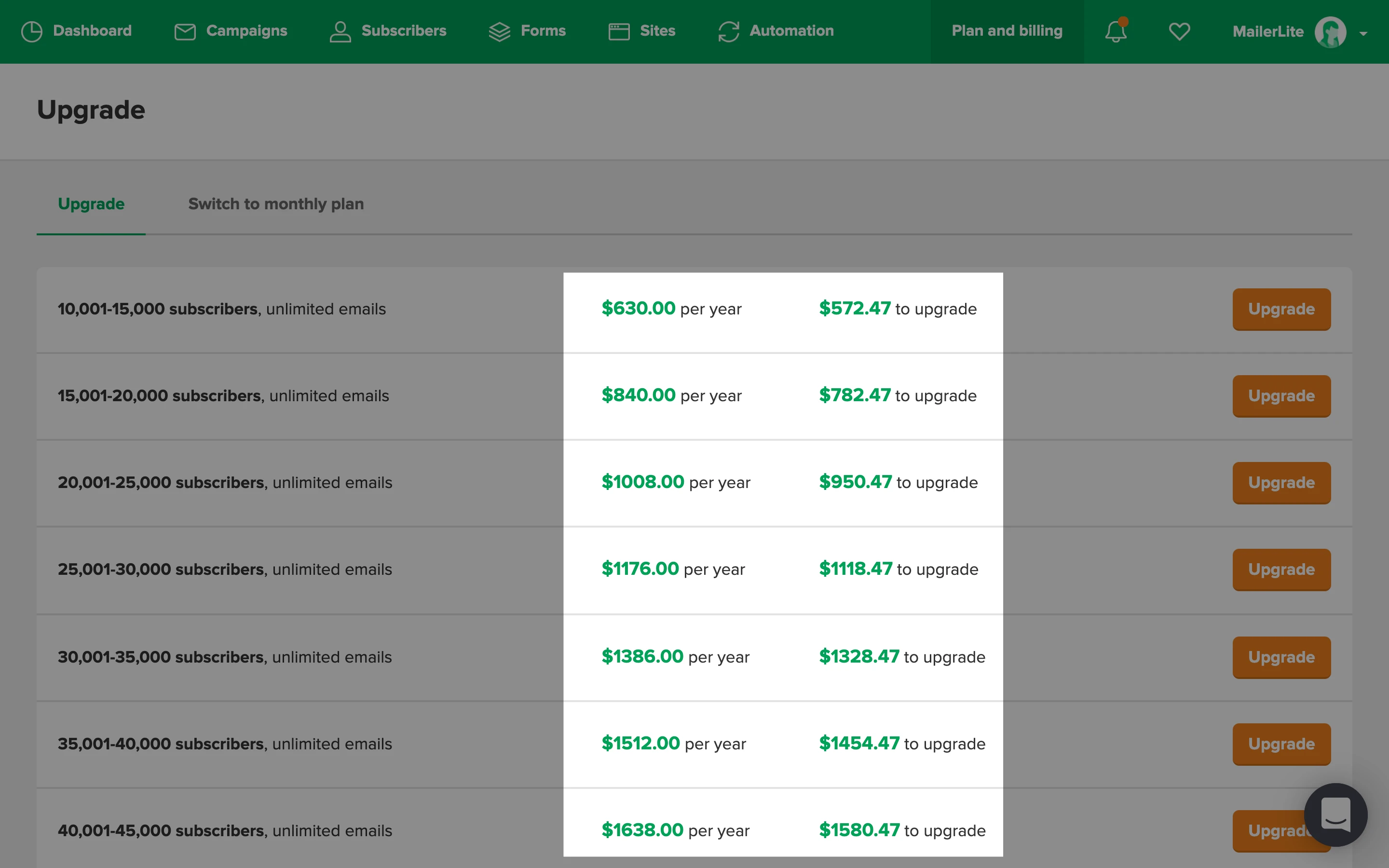 Yearly to higher monthly plan: