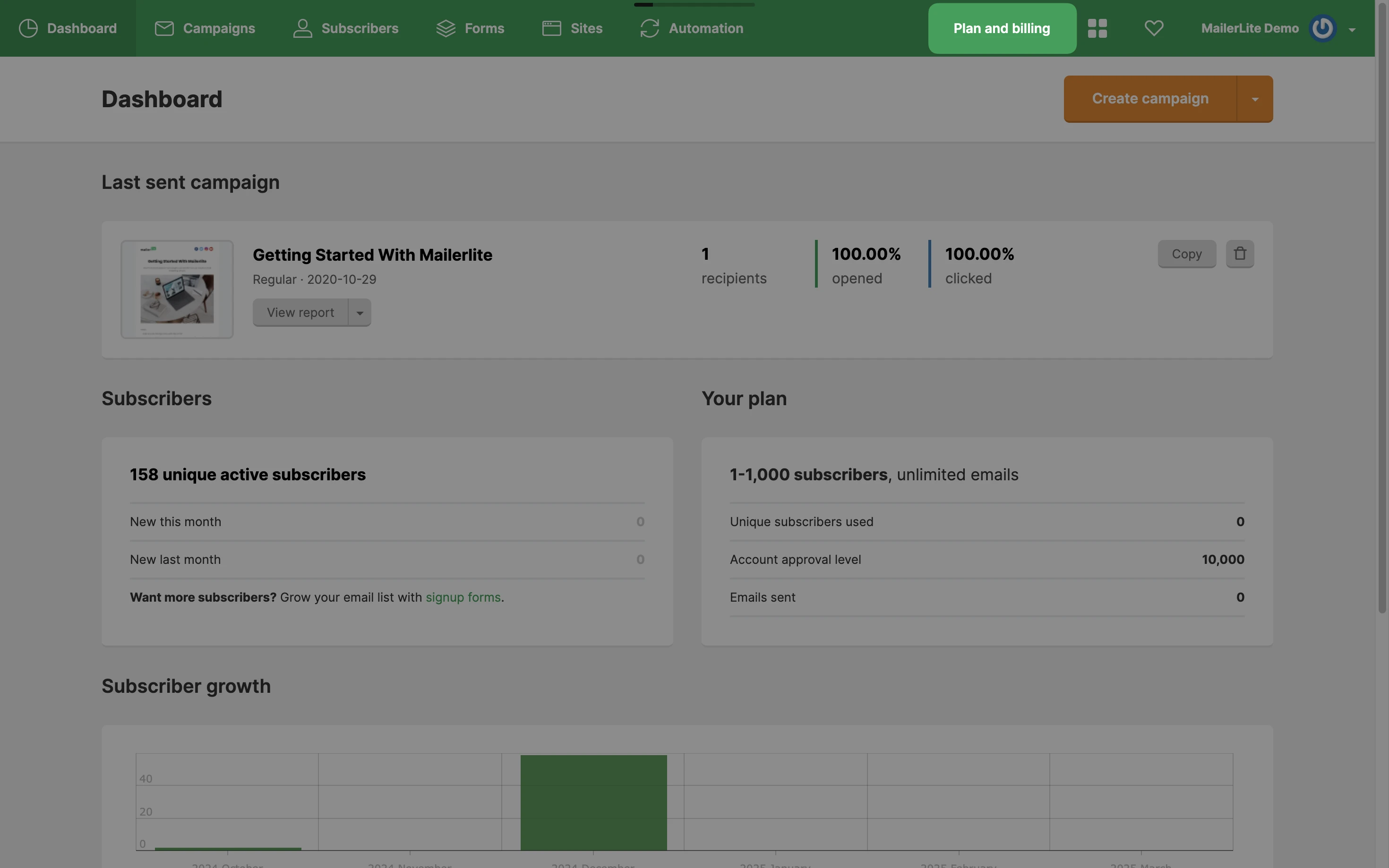 The free plan is automatically applied to every account upon approval which covers your first 500 active subscribers and the ability to send up to 12,000 emails every 30-days.