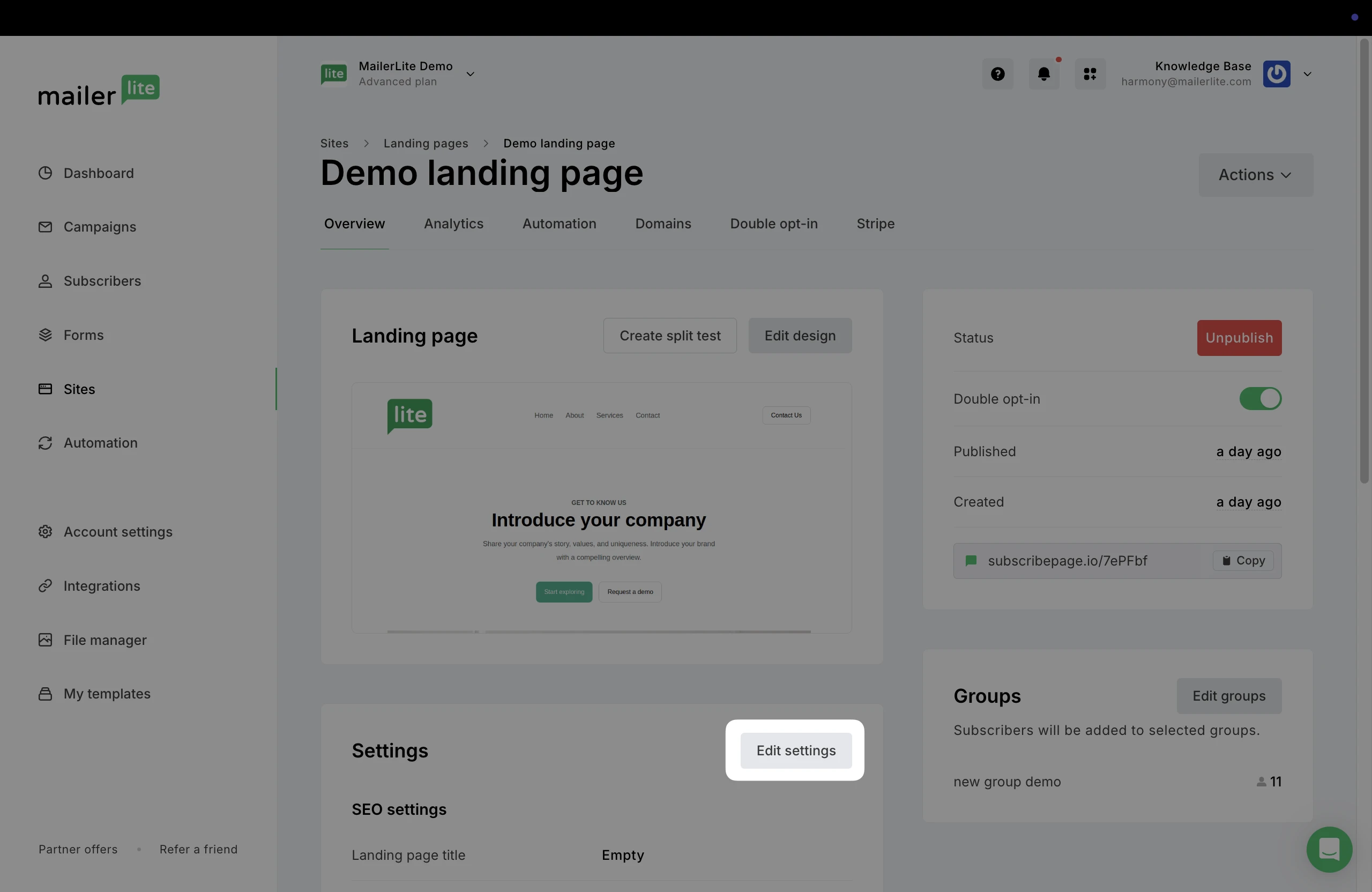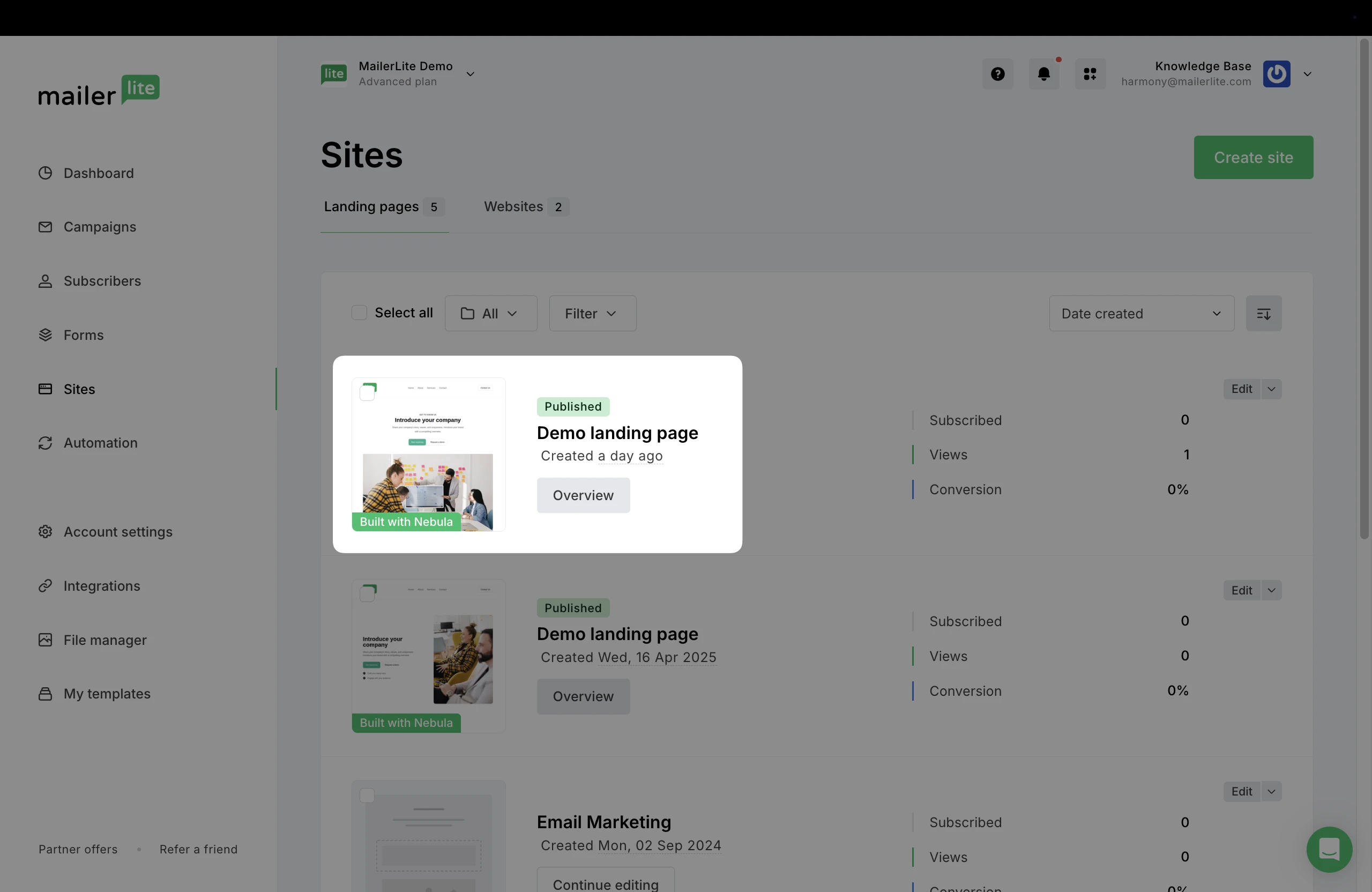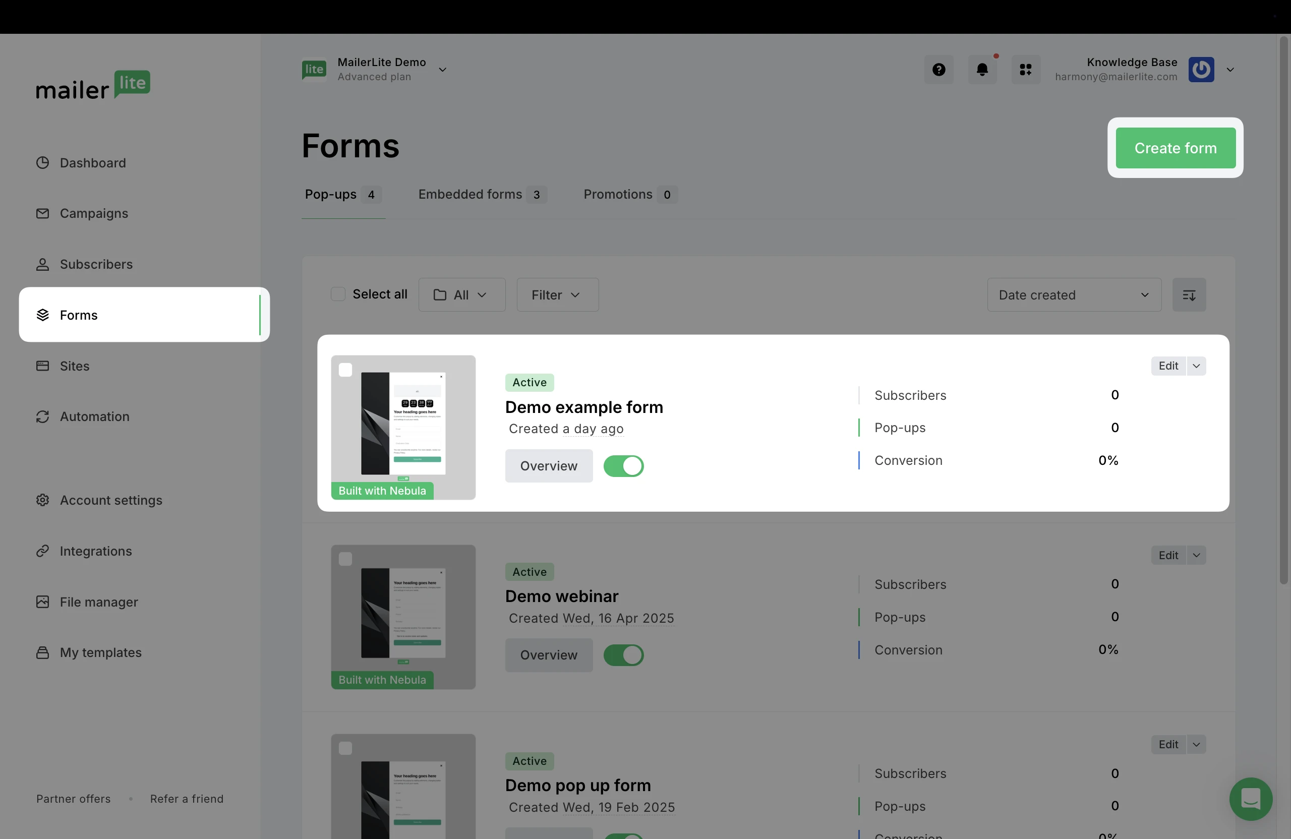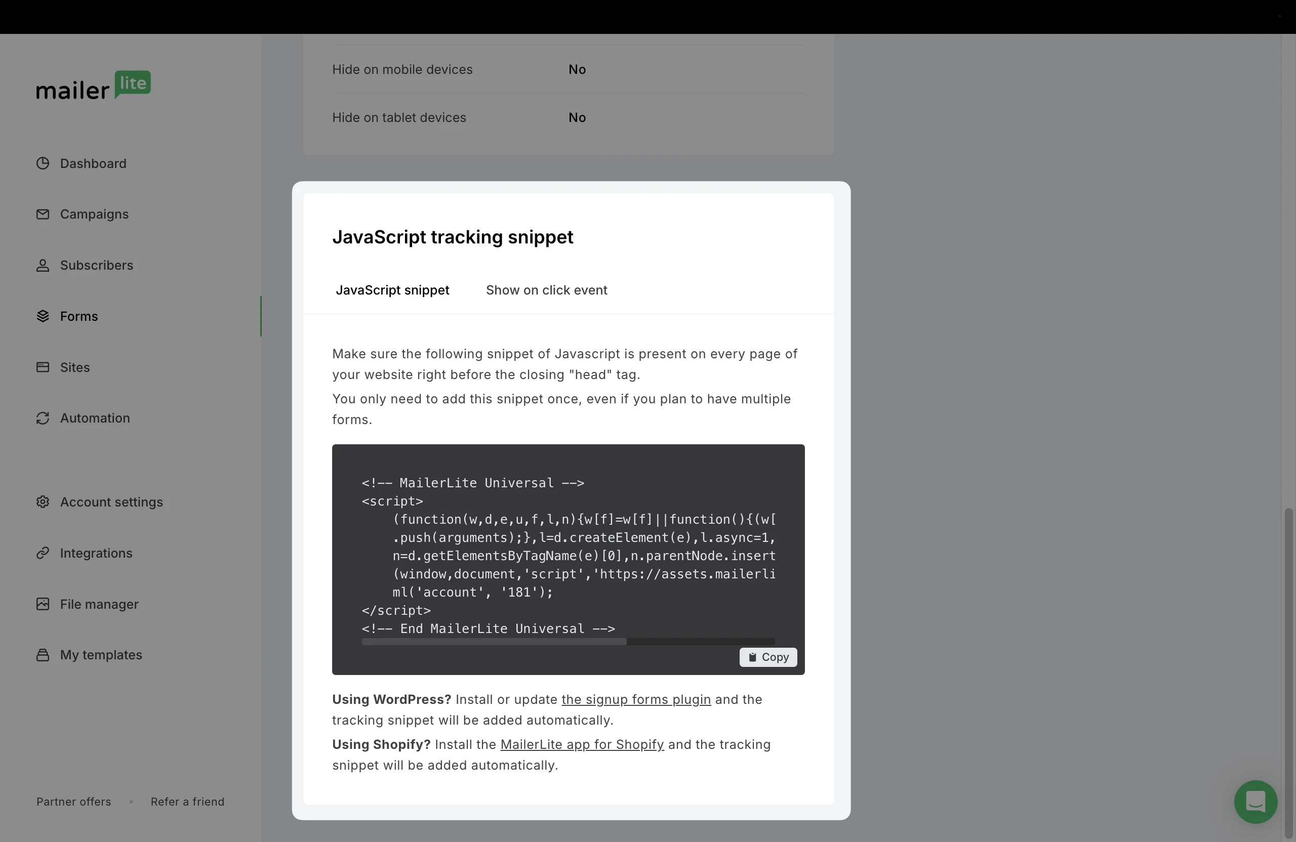 Go to your MailerLite form and grab the embed code. To do this, navigate to the form’s Overview and scroll down to the Javascript snippet.