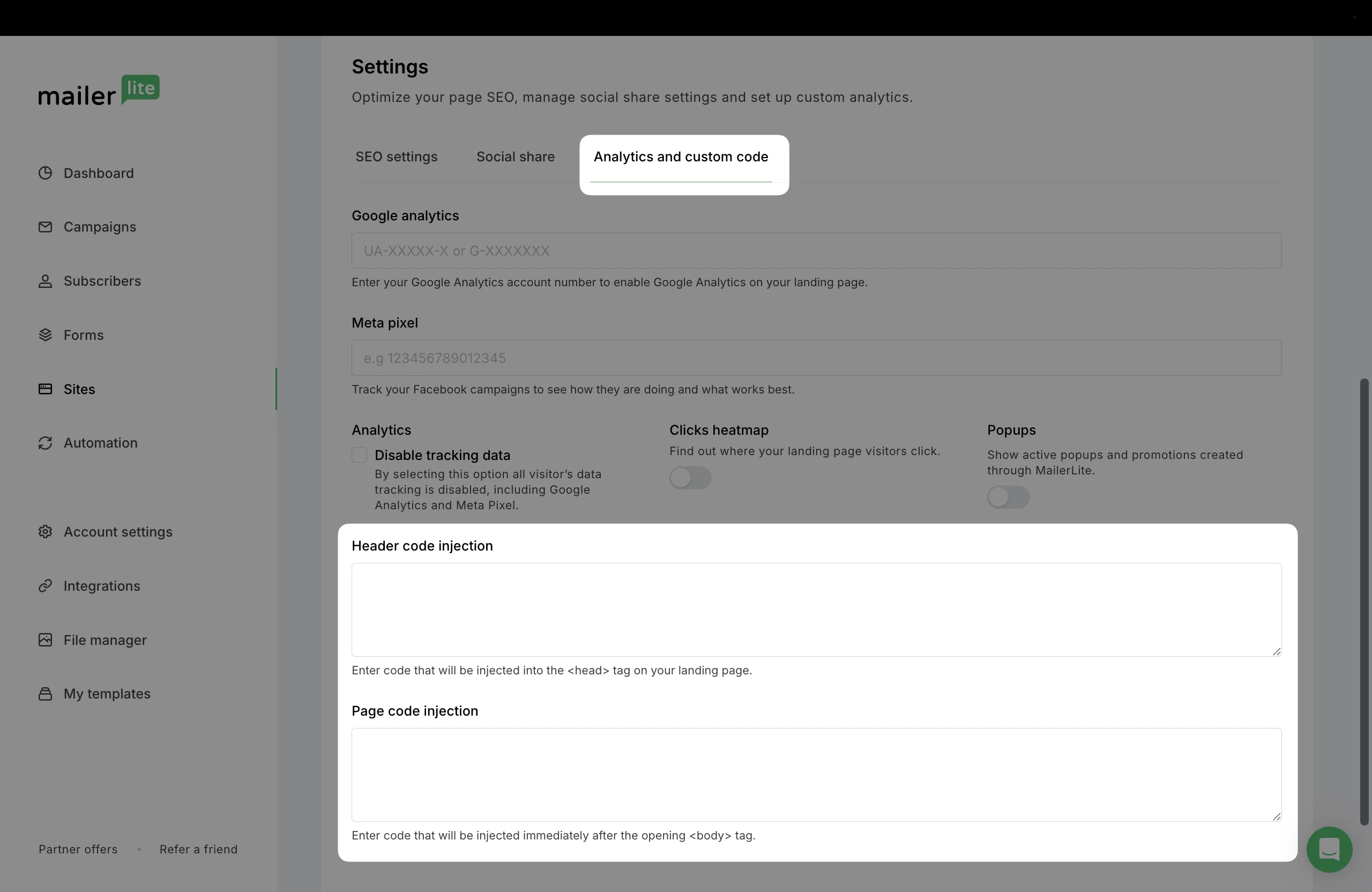 3. Go to the Analytics and custom code tab to paste the Weglot snippet into the Header or Page code injection of your site.