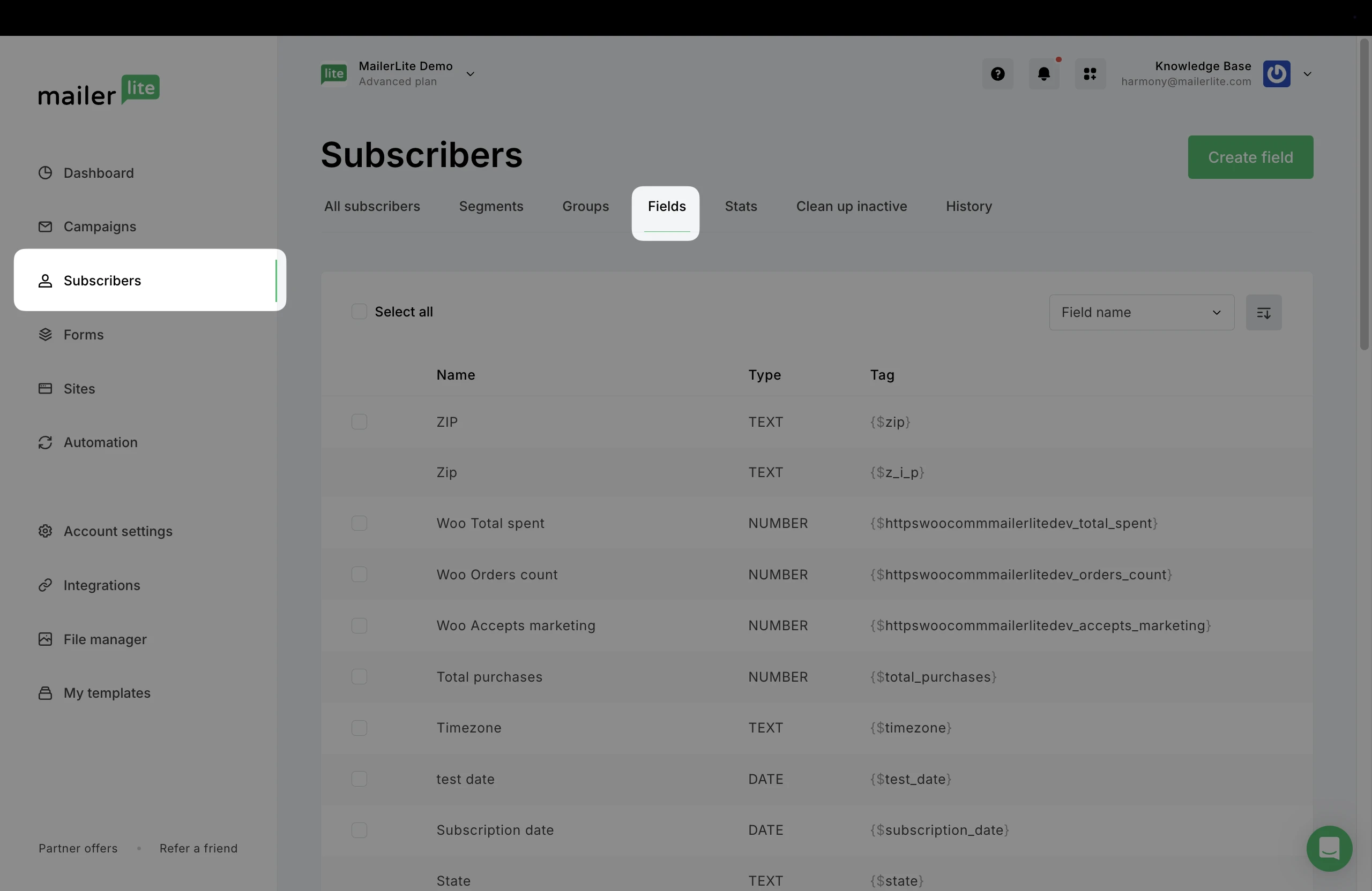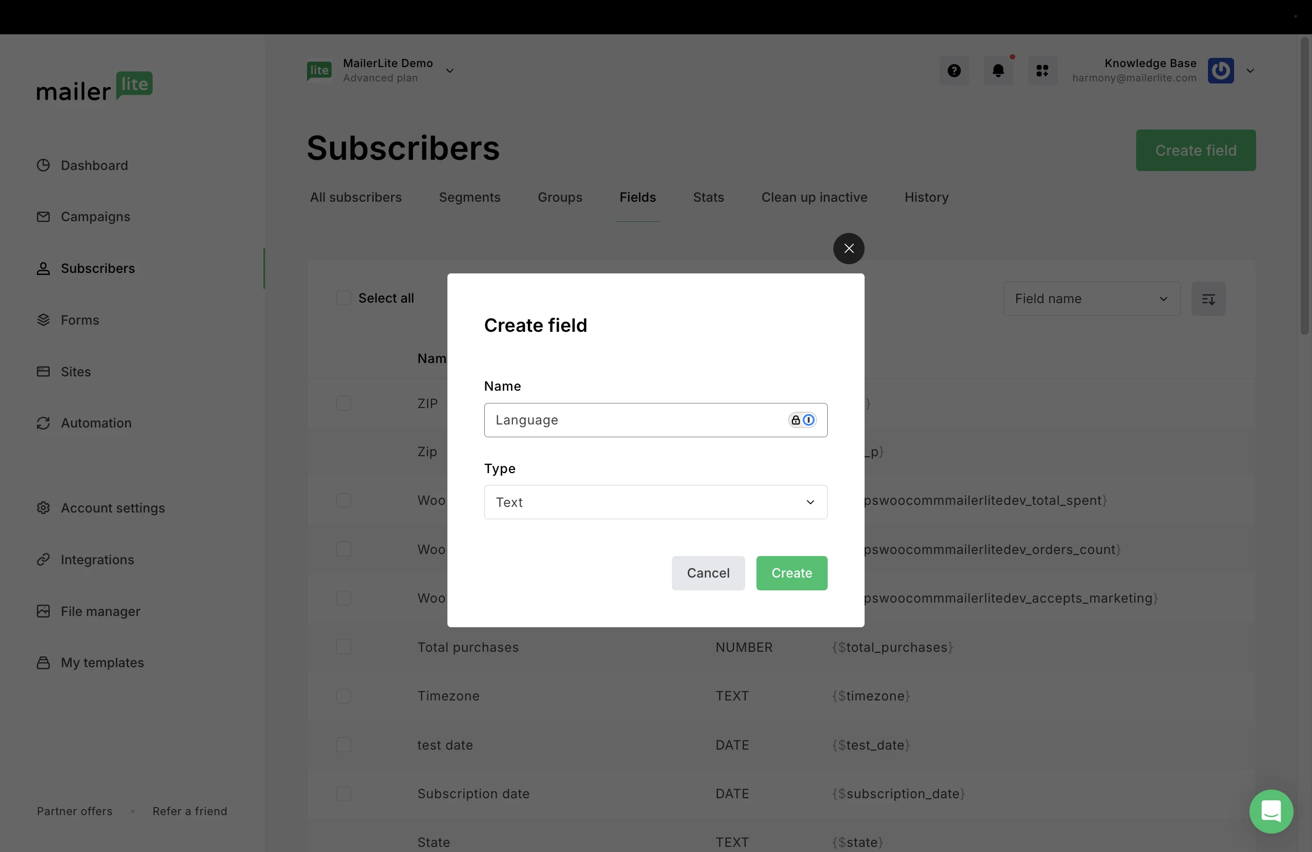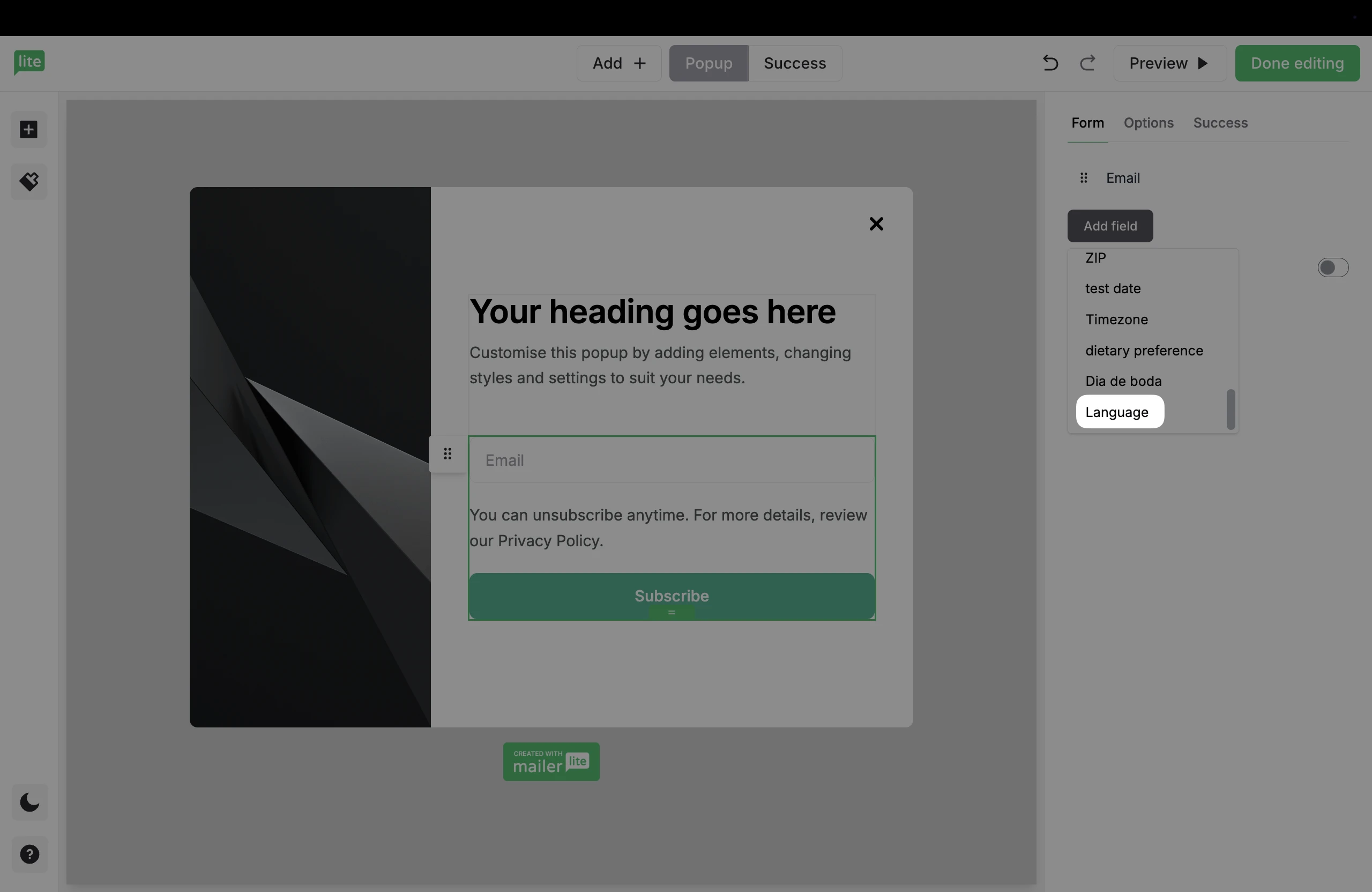 4. Click Add field to add more options besides email. Choose the newly created Language field.