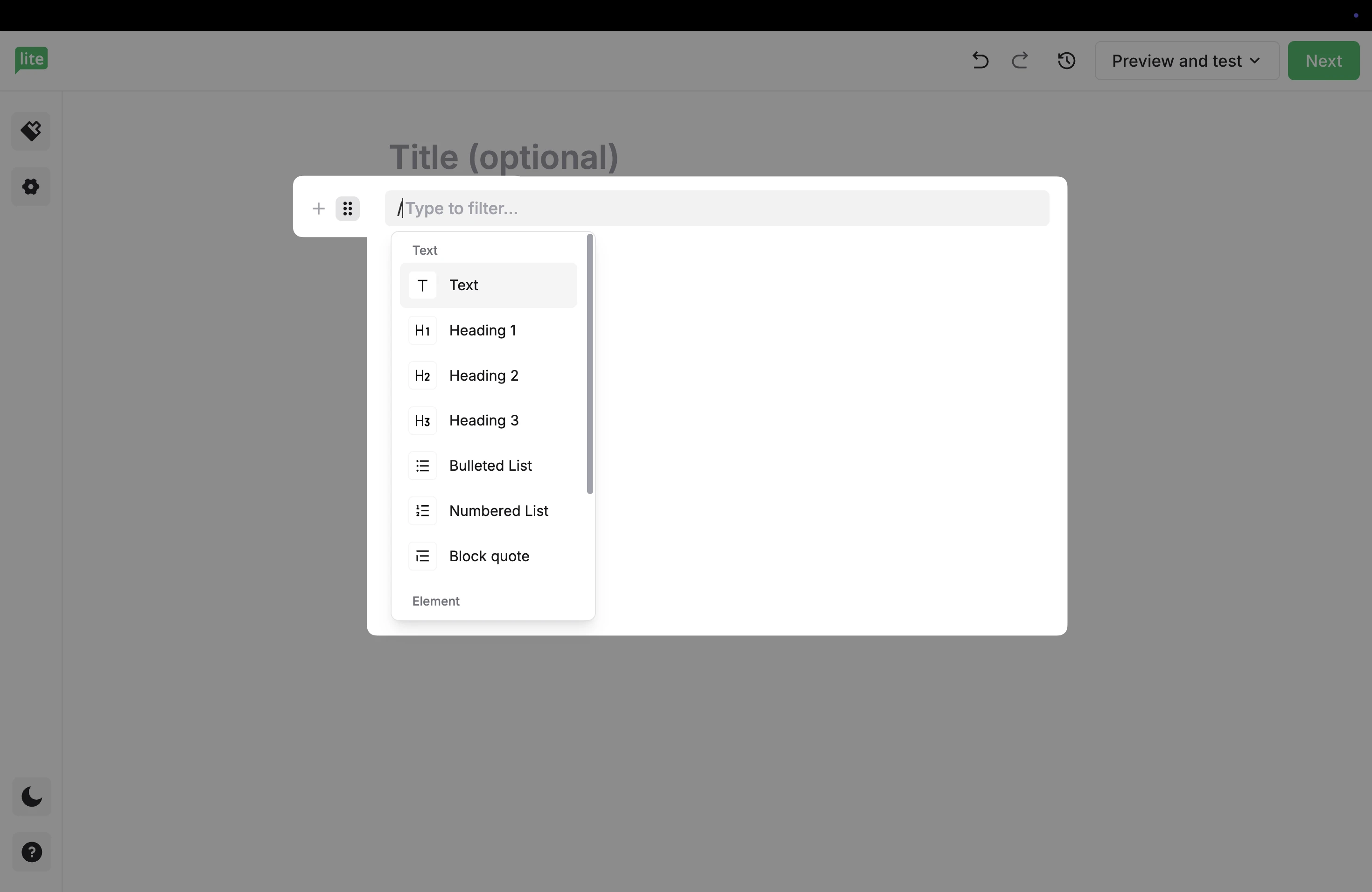 Click the + symbol or use the / keyboard command to open additional elements.