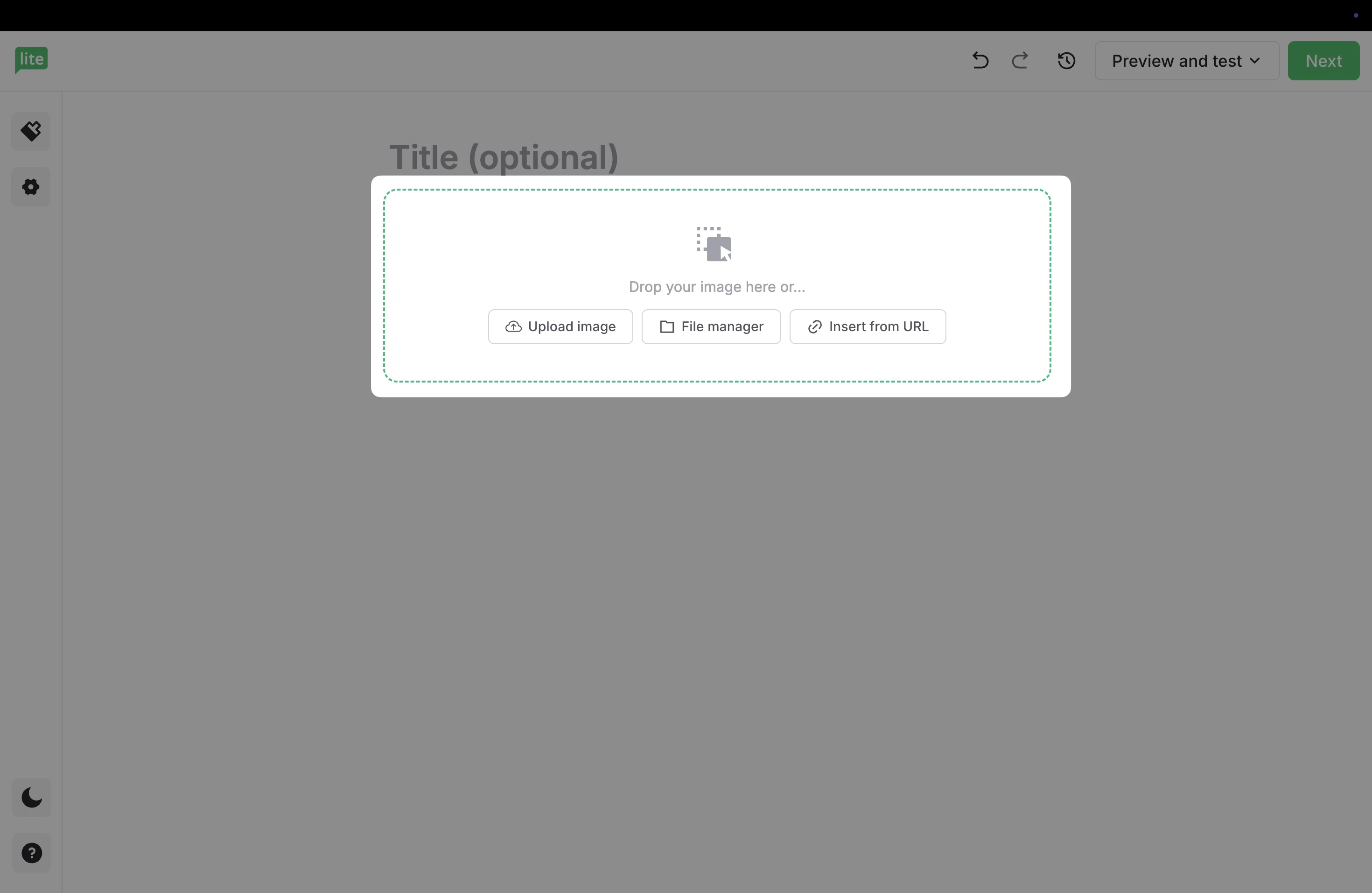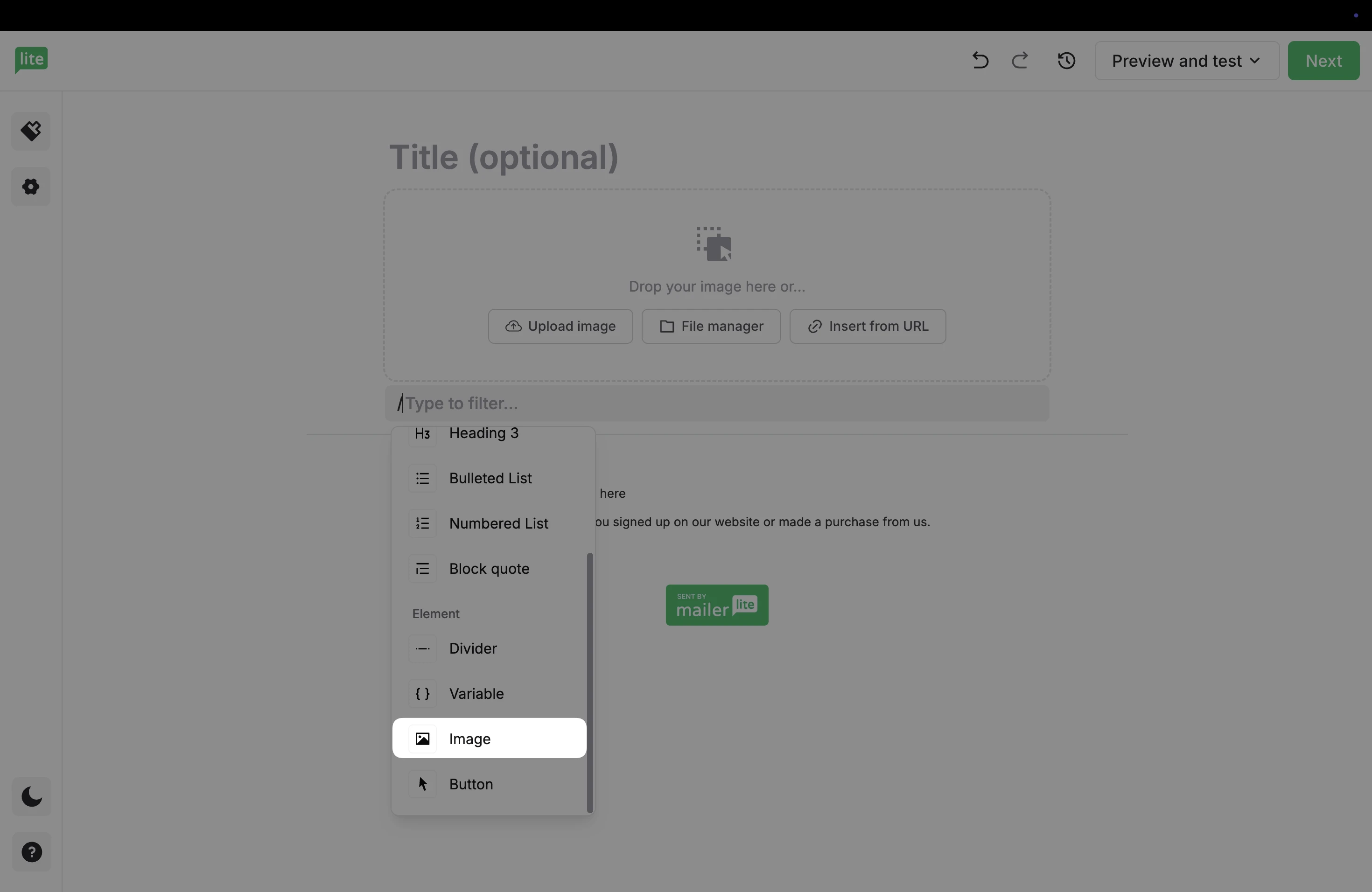 3. This will add a placeholder in your email, where you can choose how to import your image. Either upload directly from your device, import directly from the File manager, or from a URL.