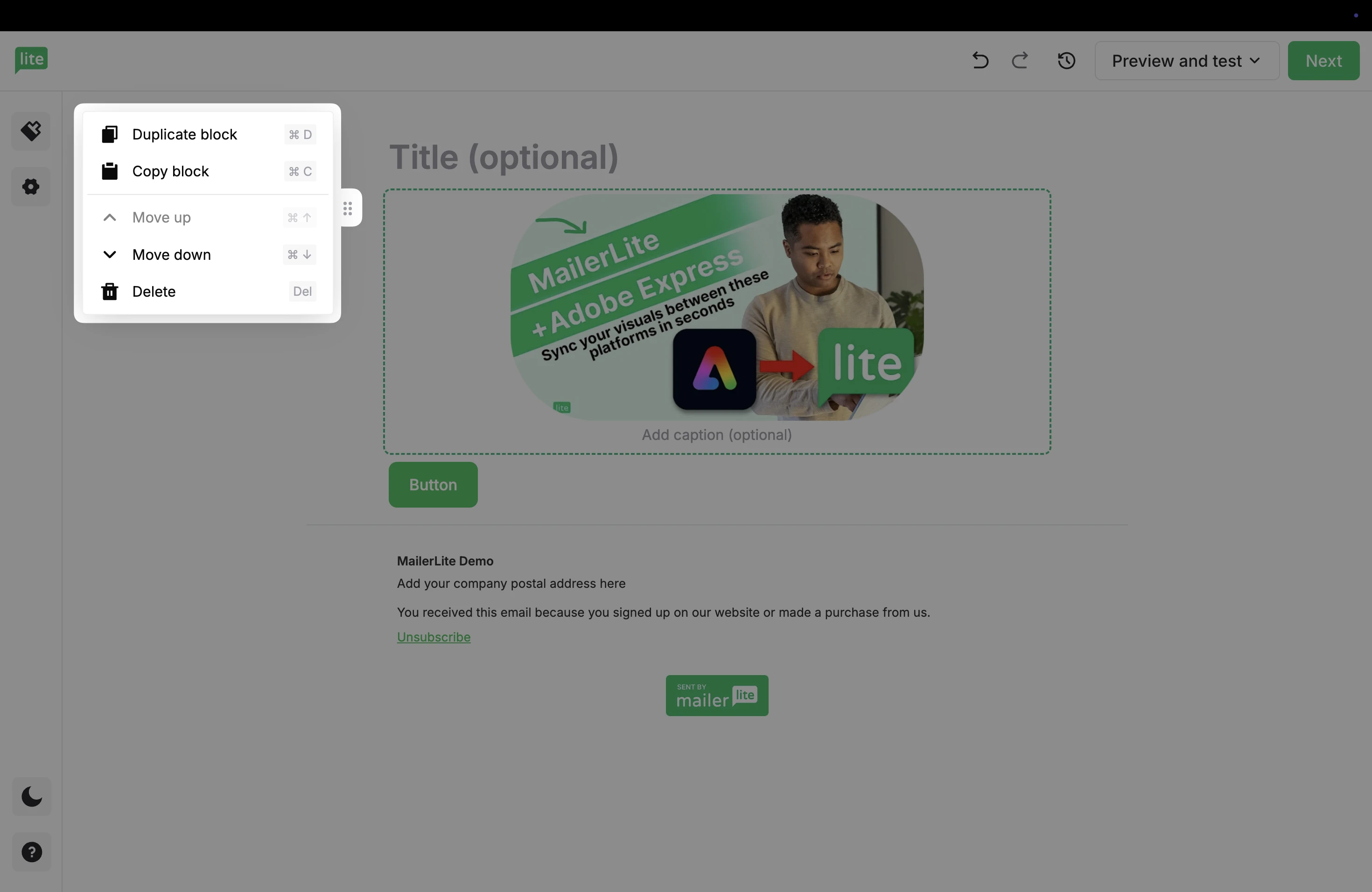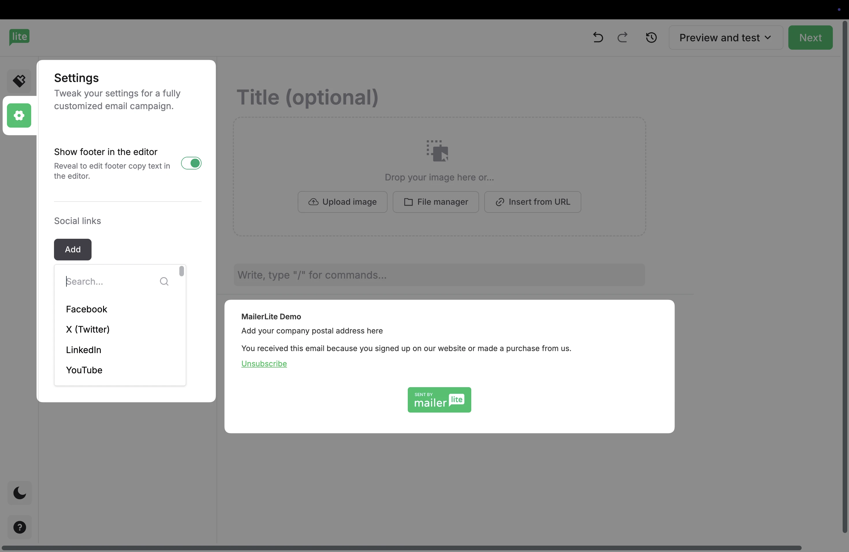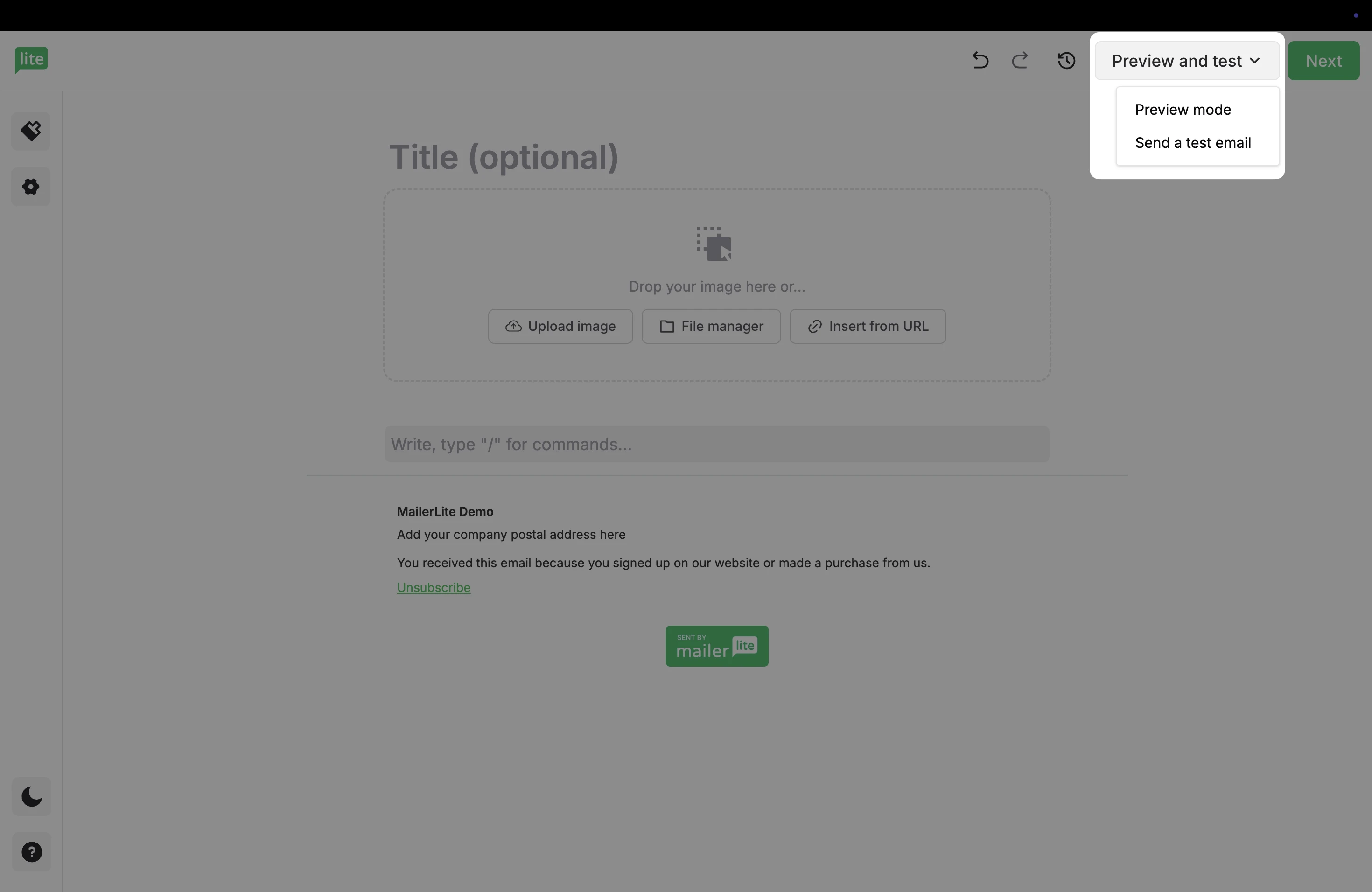 Located at the top of the editor, you have the option to Preview and test your email.