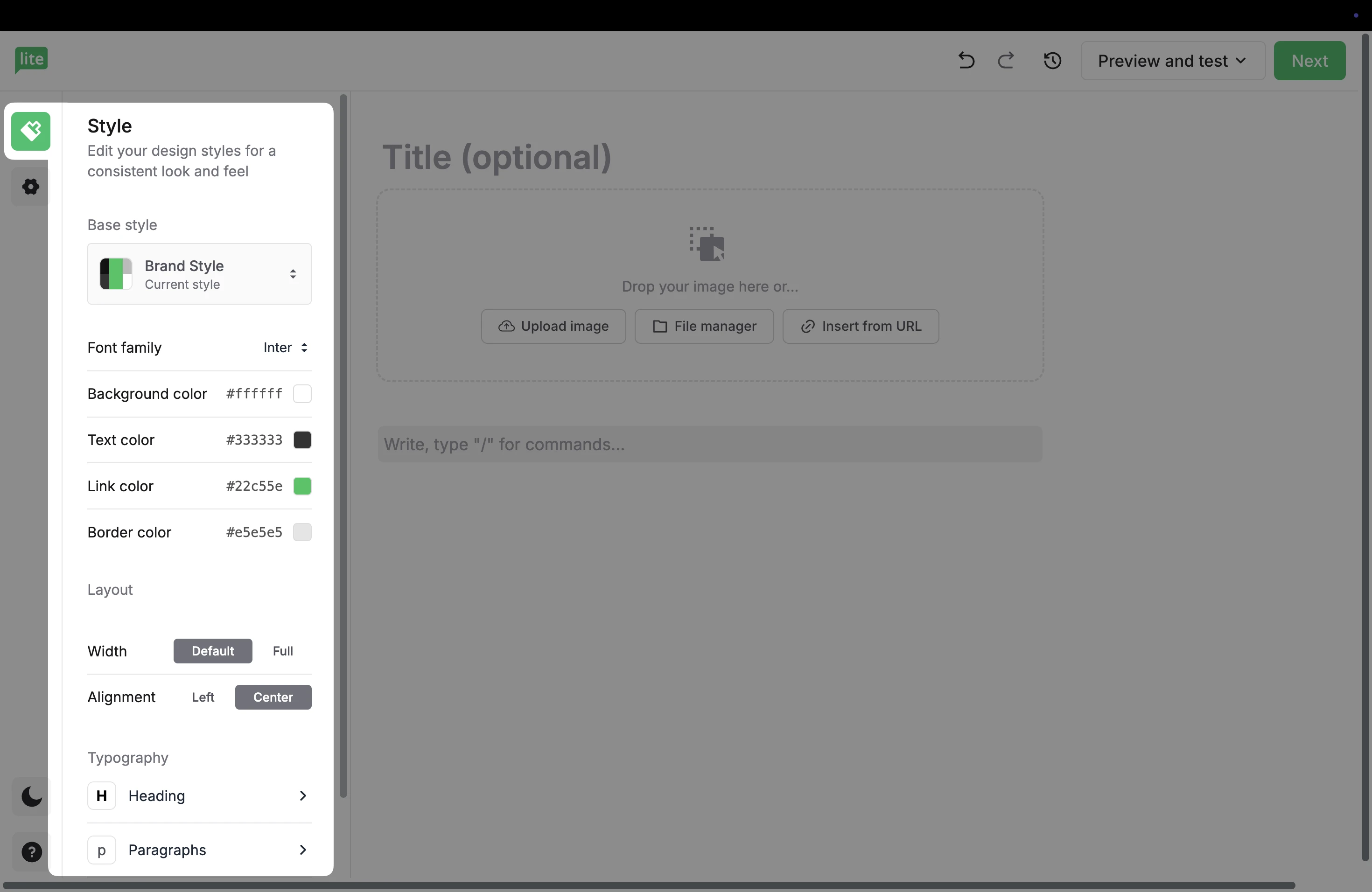 2. Here, you can set your brand style as well as additional settings such as Font family, Background color, and additional Typography settings.