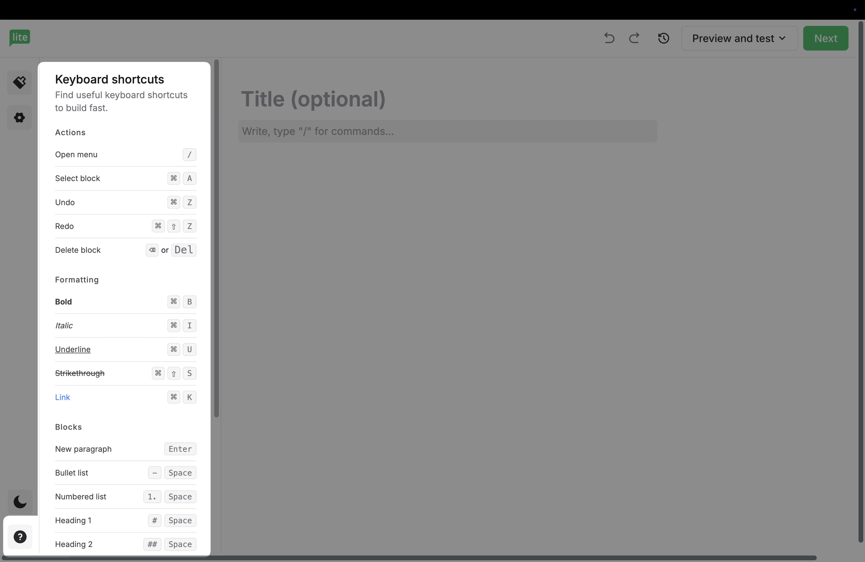 Our Simple editor is designed to be easy to use with various keyboard shortcuts to add elements to your email.