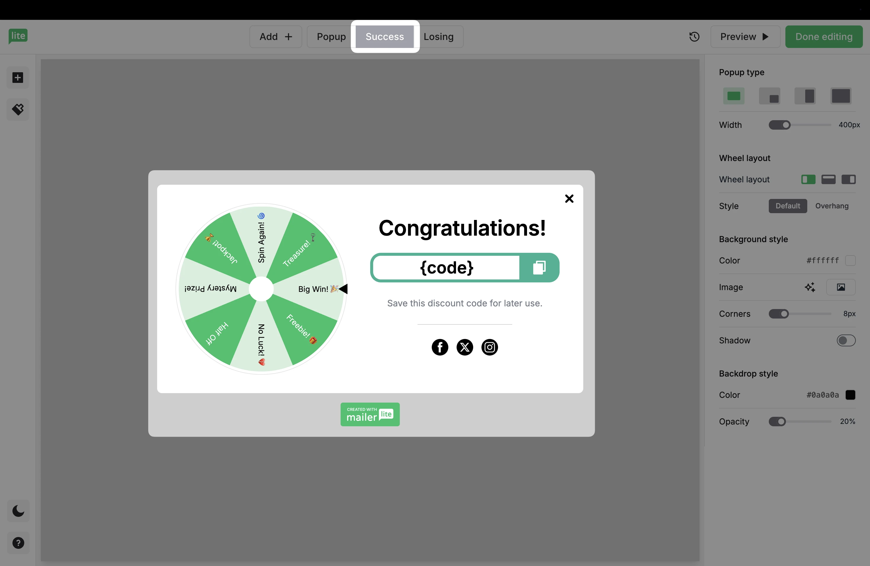 If the wheel lands on a winning slice, you can show a custom message and a discount code. This text and code are fully customizable.