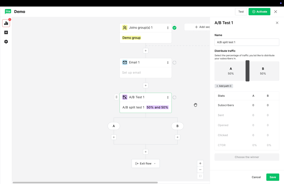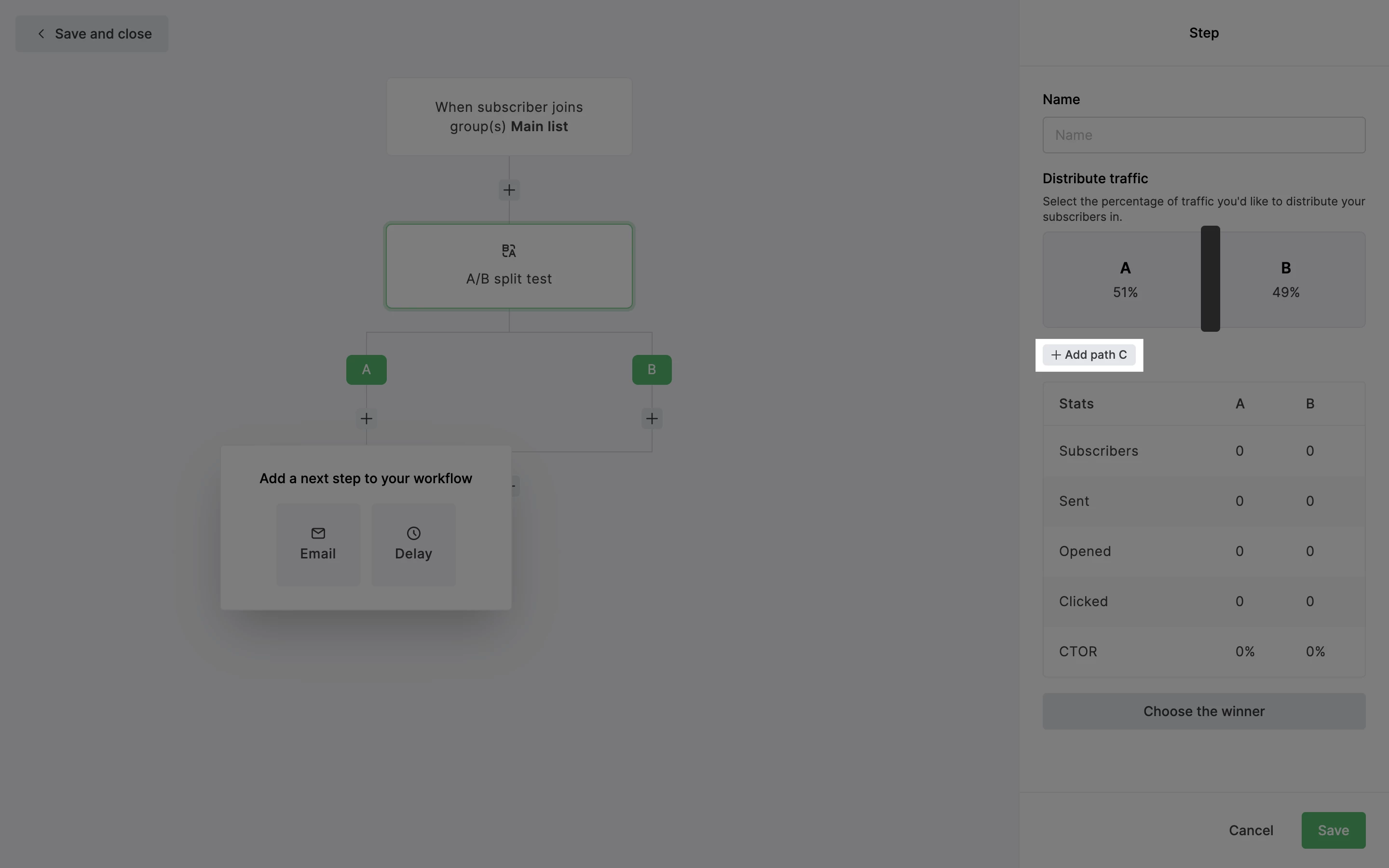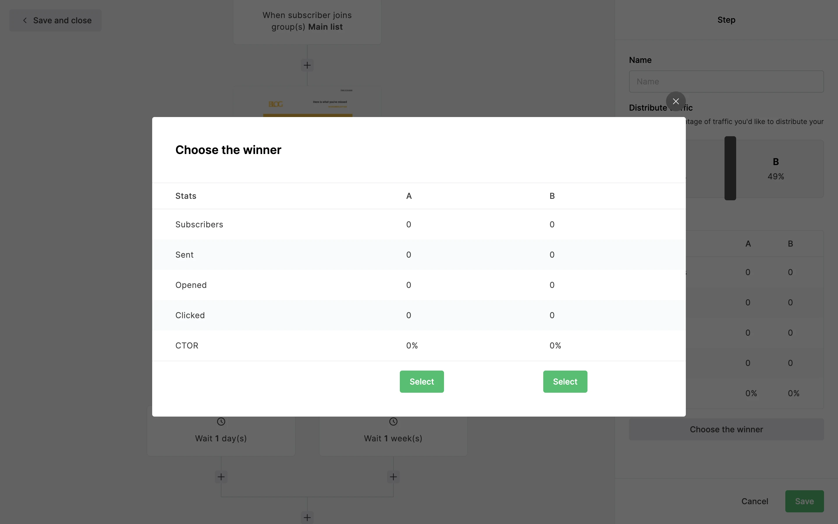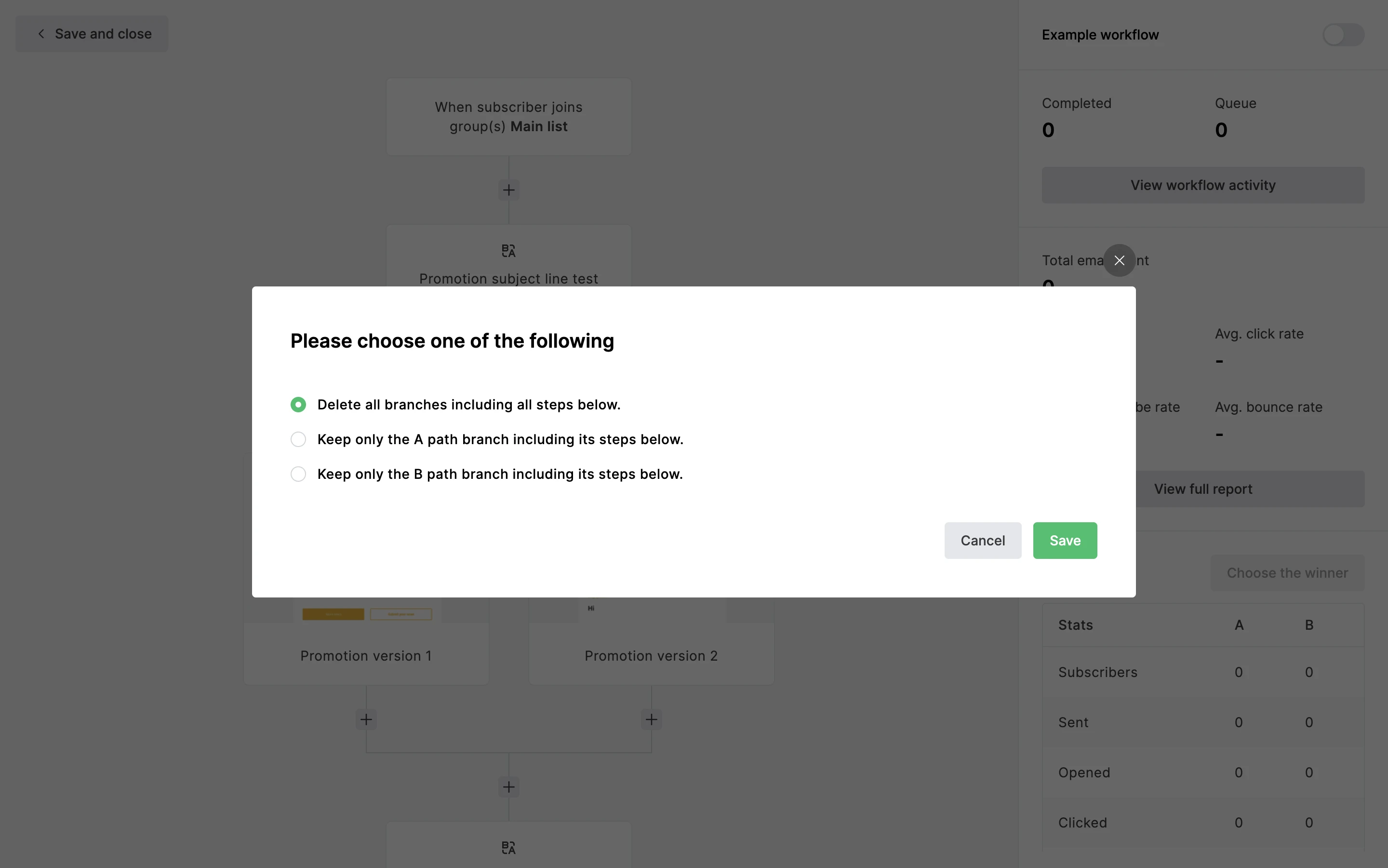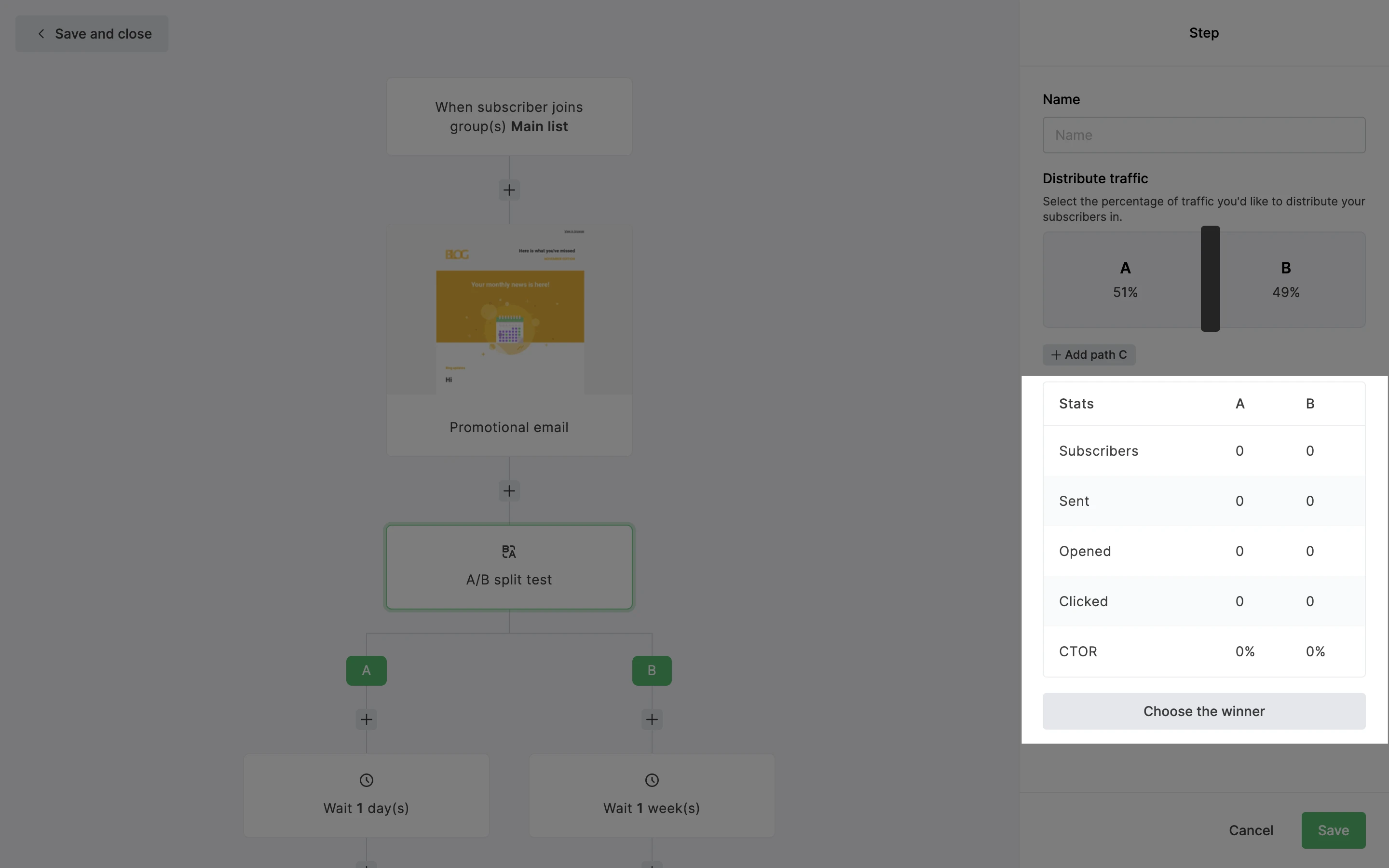 7. To check the stats and choose a winner for your A/B split test, open your workflow editor, select the A/B split testing step and click Choose the winner.