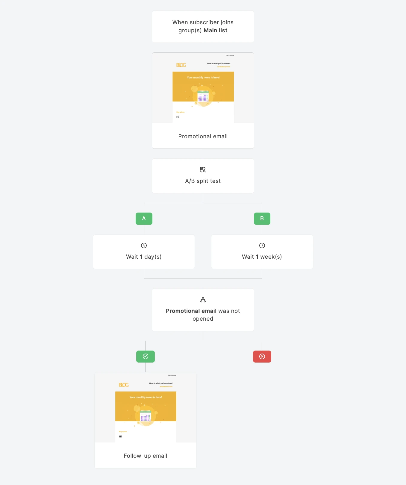 In this example, the workflow sends out a promotion followed by a follow-up email for non-openers. The A/B split test step is used to test the length of time between each email.
