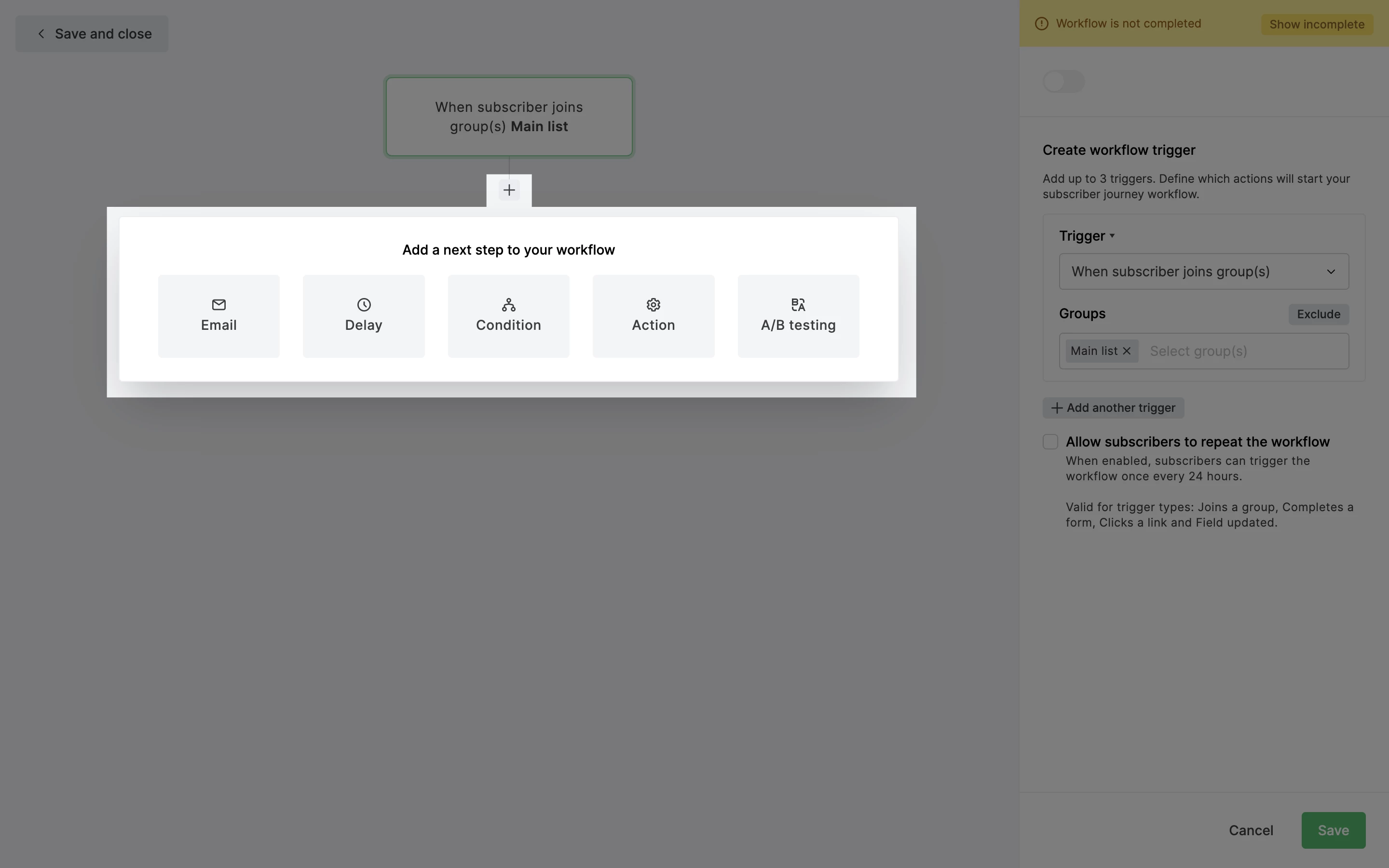6. Once you’re happy with your split test, click the single + icon at the bottom to continue building your workflow.