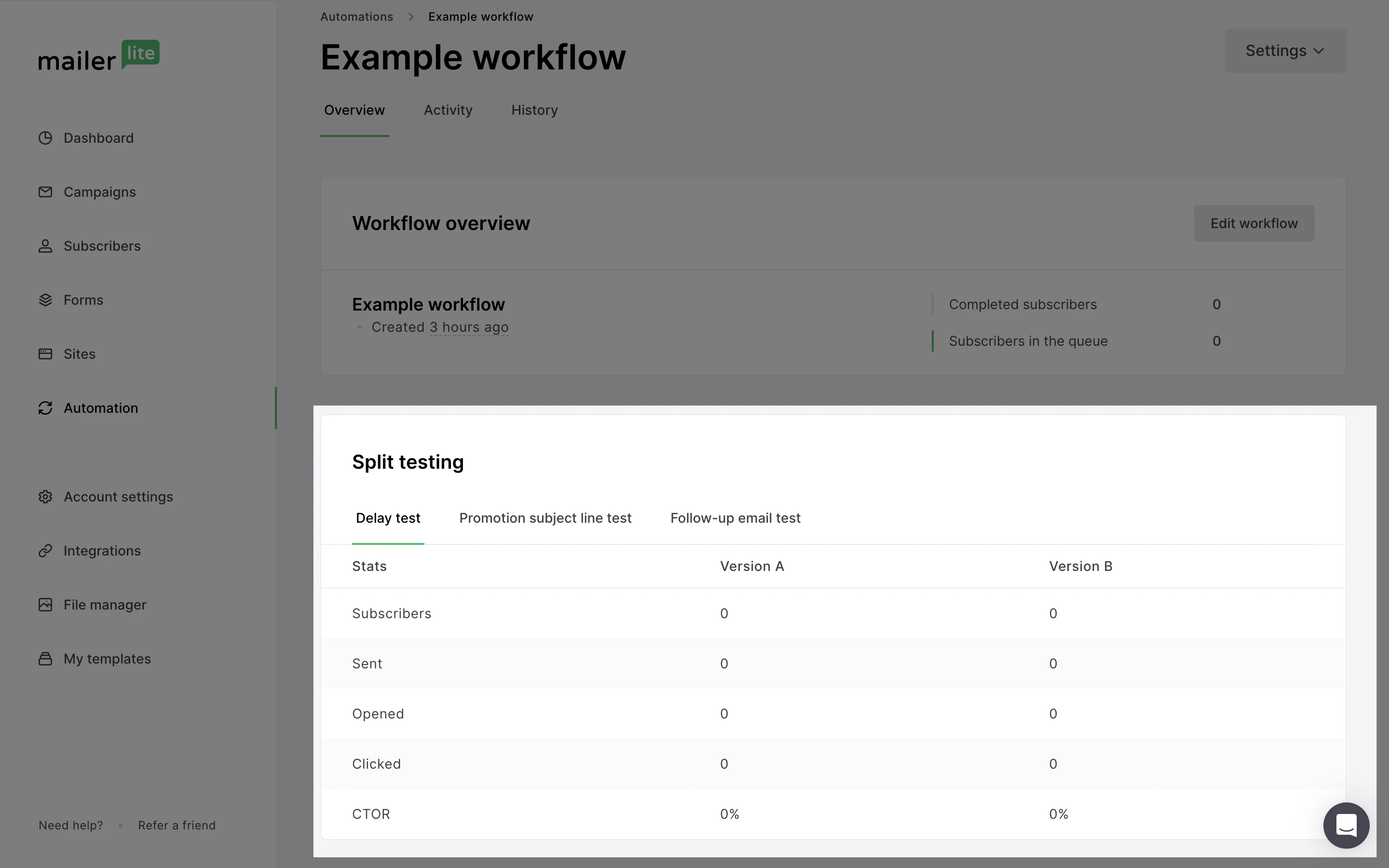You can also monitor the progress of your A/B split test(s) by navigating to the workflow’s overview page.