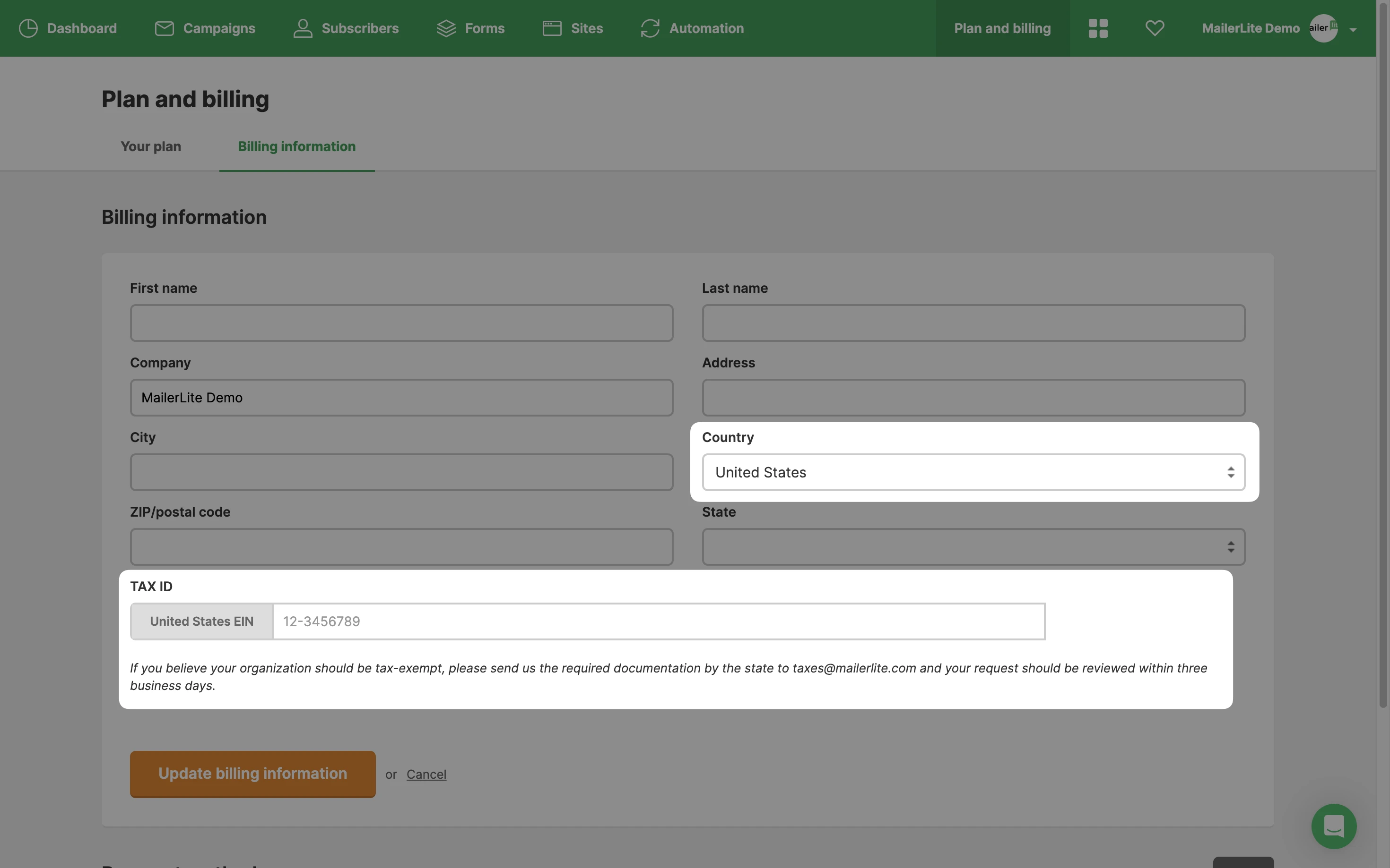 If you believe your organization should be tax-exempt, please send us the required documentation by the state to taxes@mailerlite.com and your request should be reviewed within three business days.