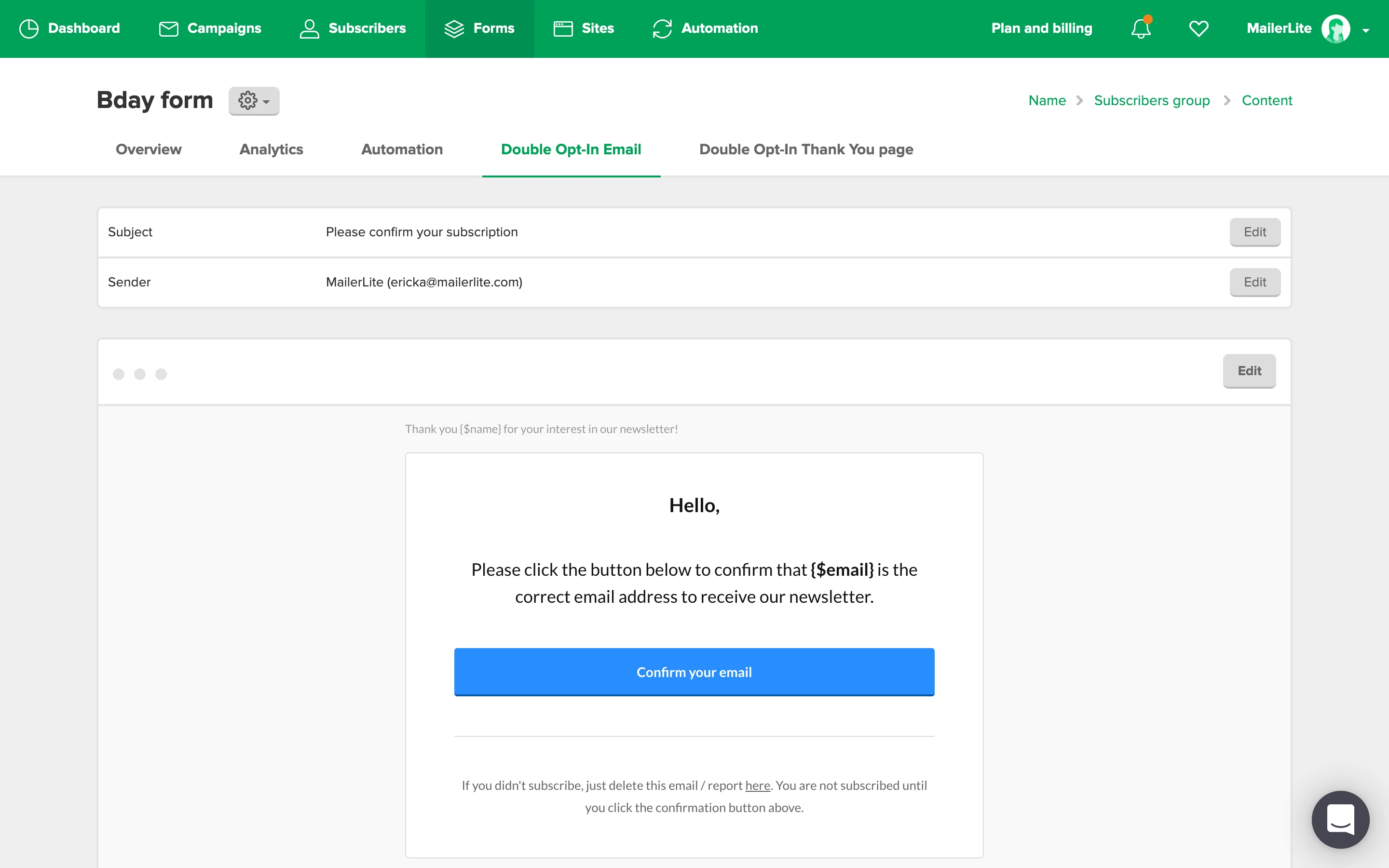 A confirmation email, which you can edit under the form’s Double opt-in tab, is sent. Here, they have to click the confirmation button to confirm their subscription to your newsletter.