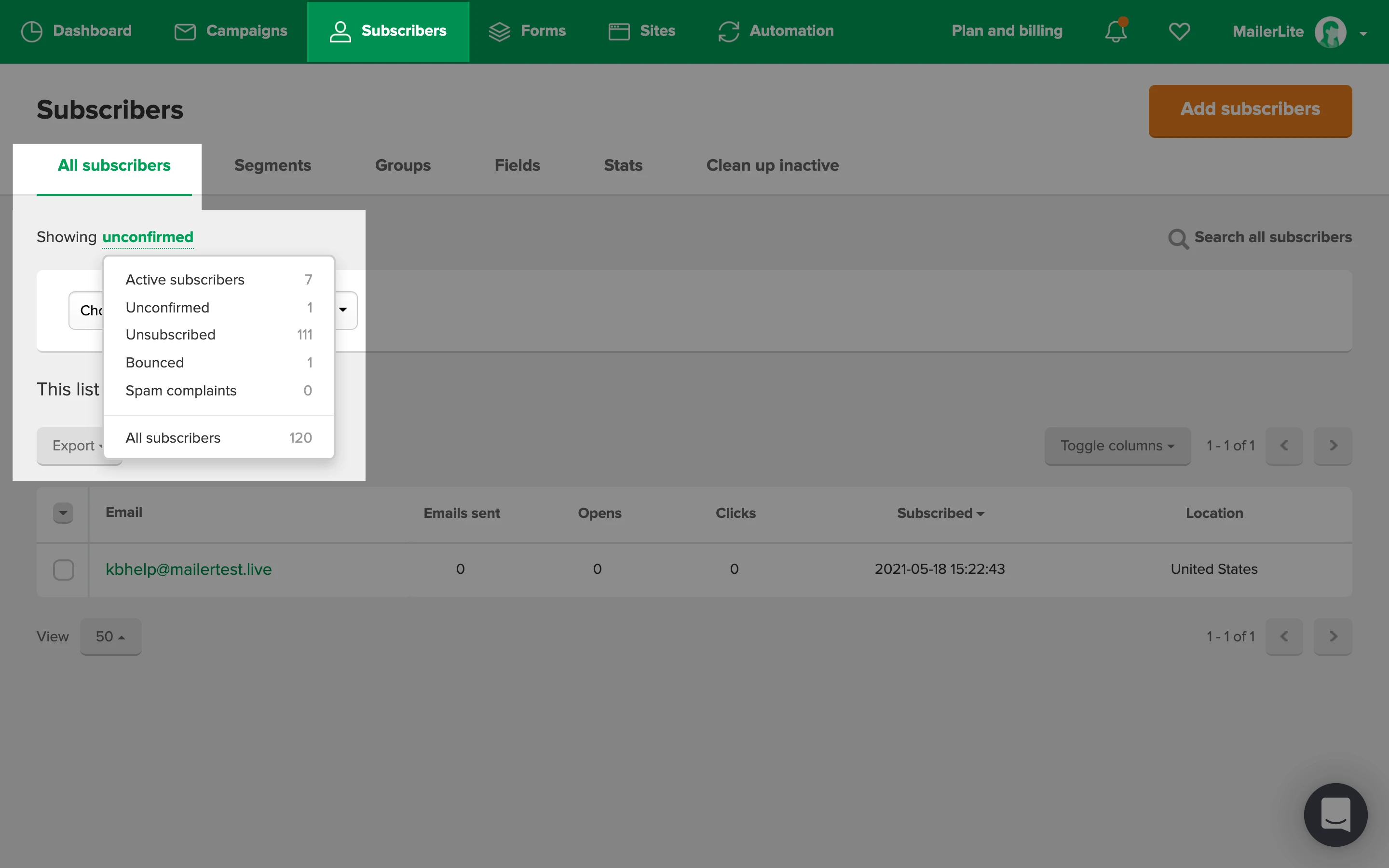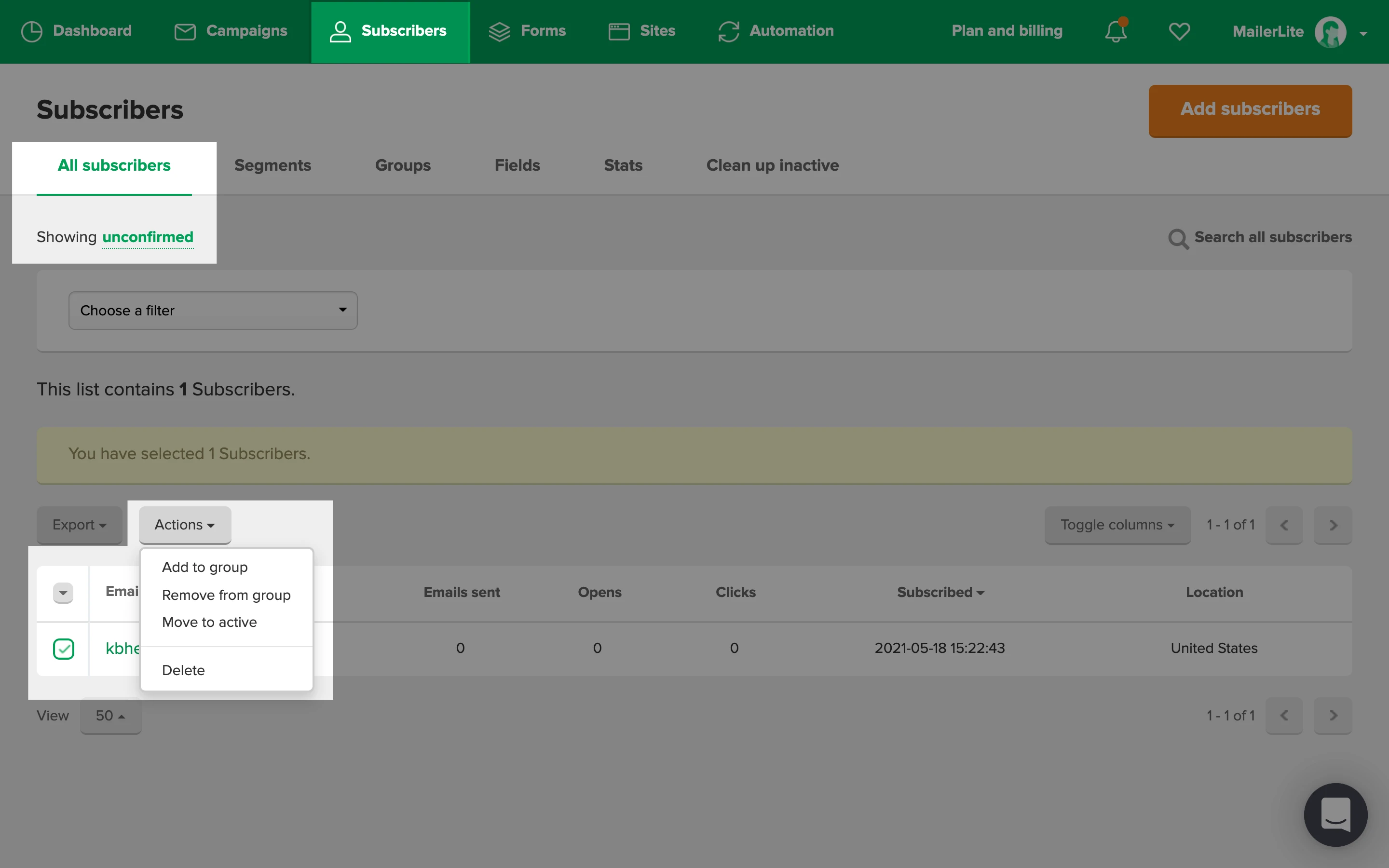 Click on the Active subscribers dropdown menu and select Unconfirmed from the list.