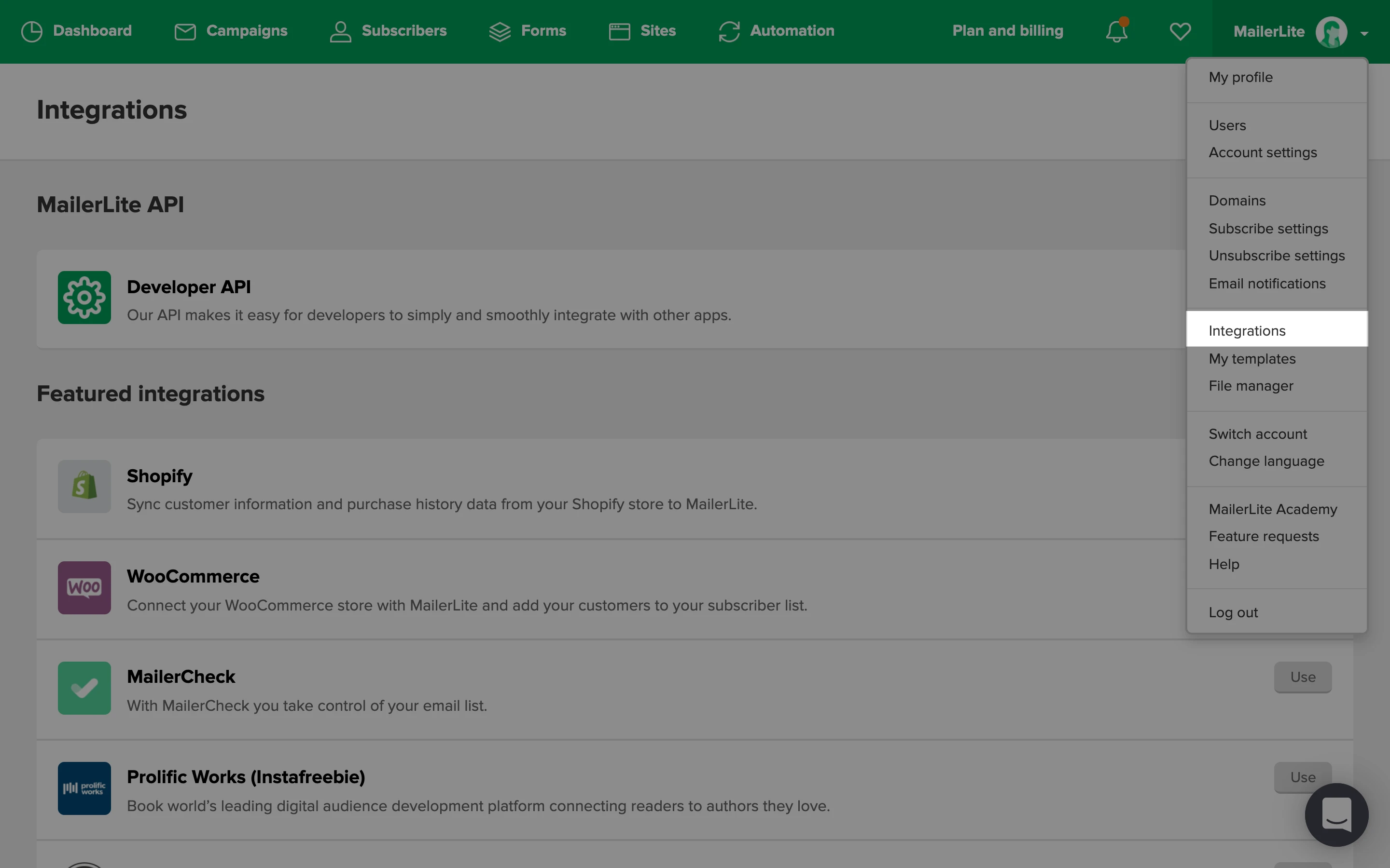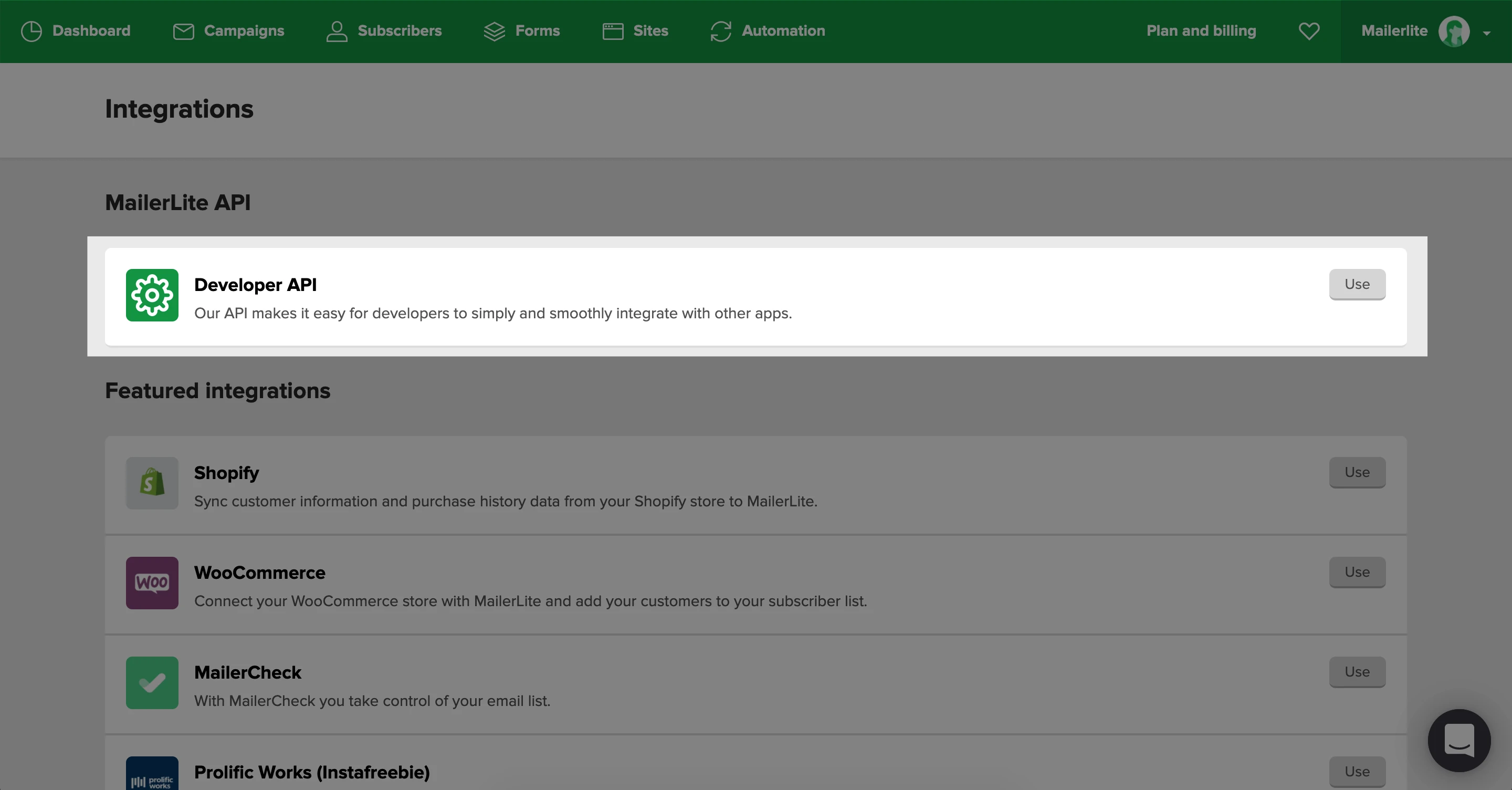 MailerLite uses API to receive and send data to other applications, so you can transfer information and connect to other apps. For example, a customer who purchases a product in Shopify can be brought over to MailerLite as a subscriber using our Shopify integration. Using your unique account API token, you can choose from over 100 pre-developed integrations with MailerLite.