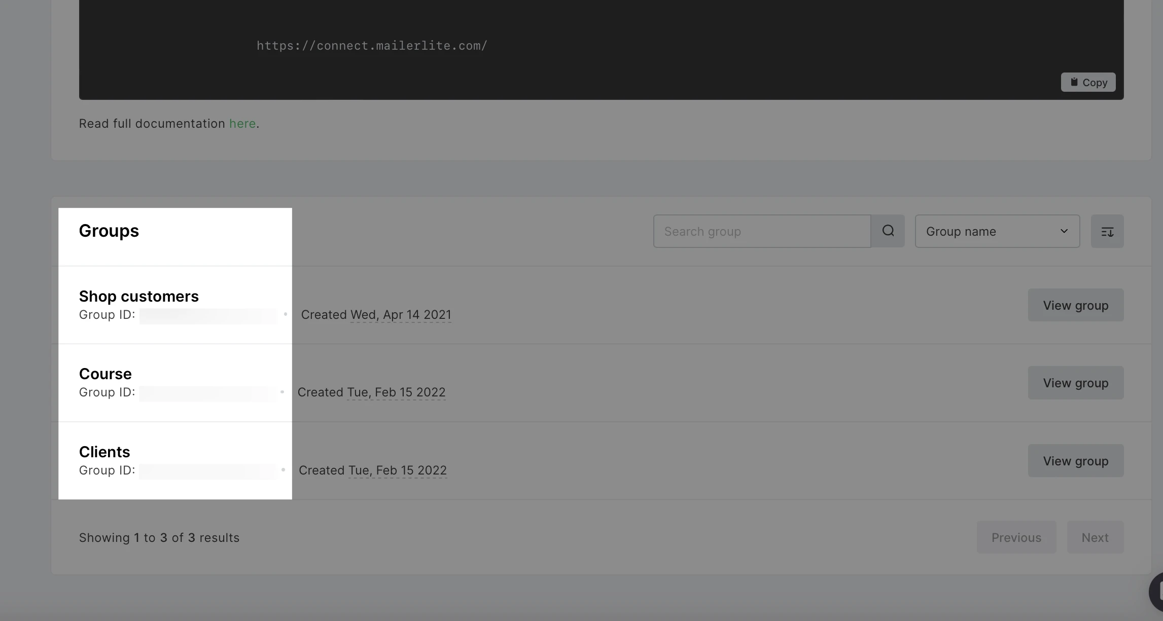 4. Scroll down to the Groups section to find the Group IDs for the groups in your account.