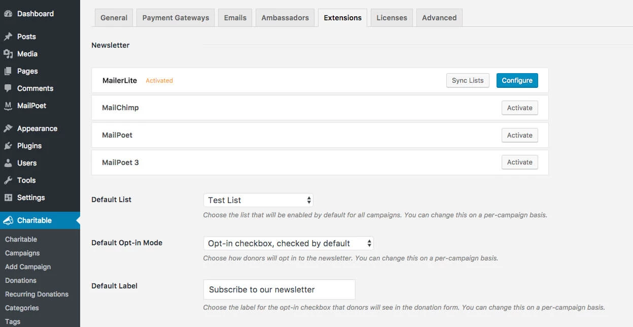 Once the plugin is installed on your WordPress website, click on Charitable and select the Extensions tab.