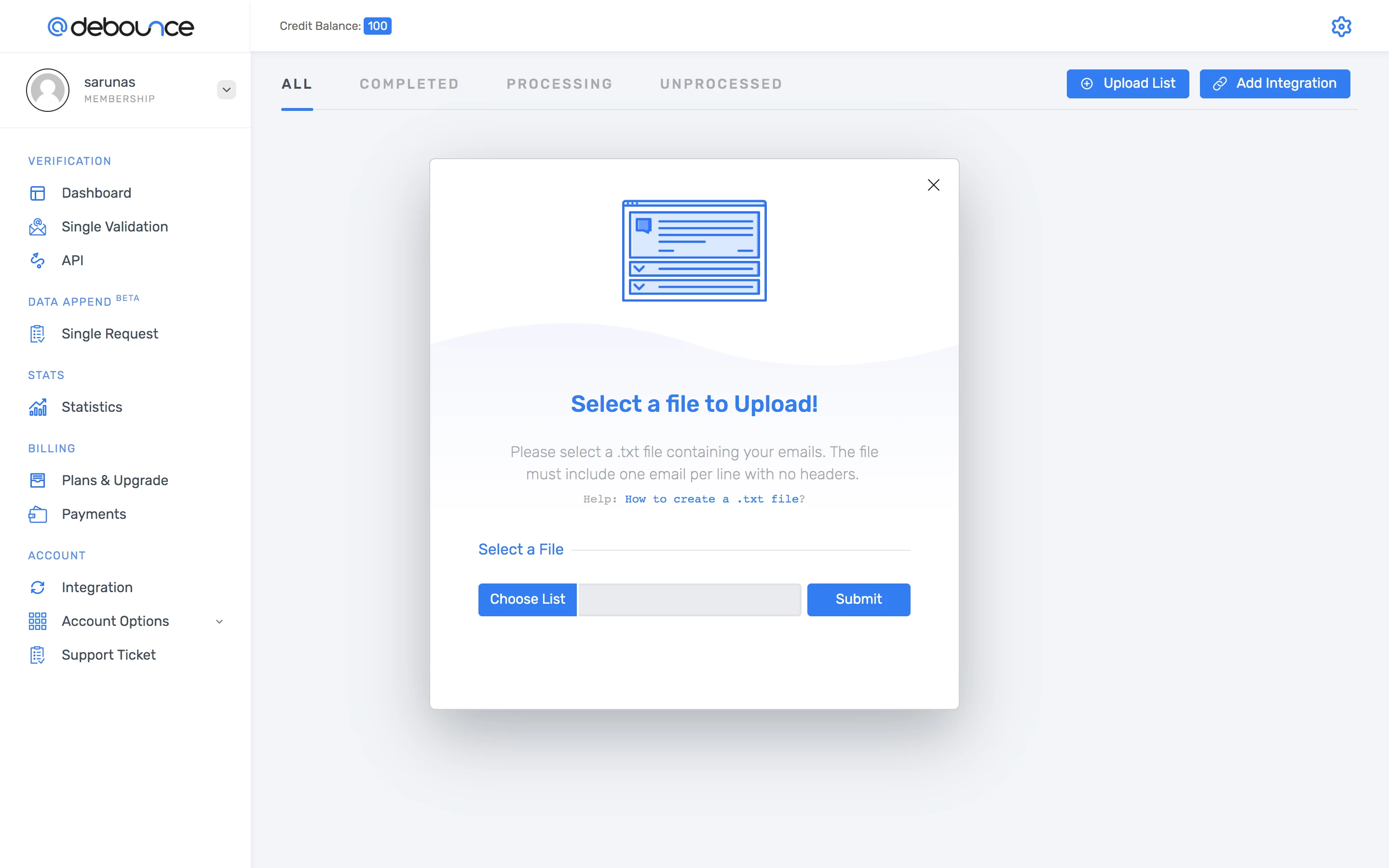 1. On DeBounce, click on Integration under Account on your dashboard sidebar.