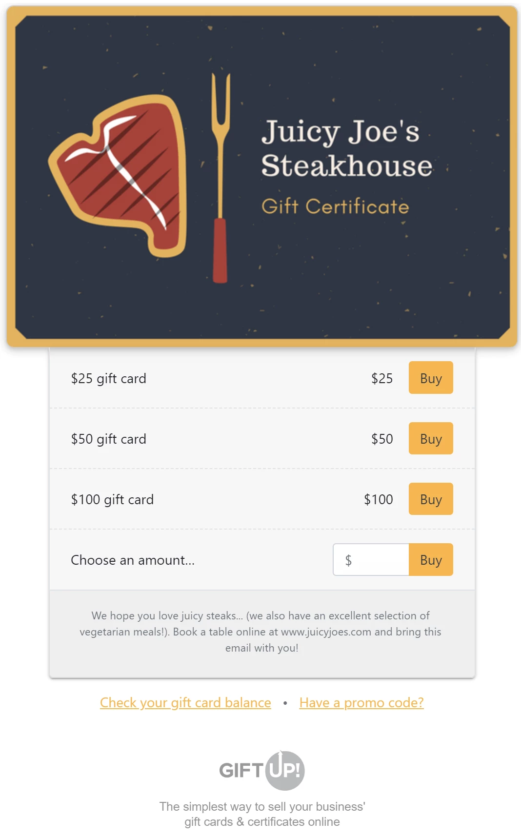 Gift Up! is a platform that facilitates the selling of your business’s gift cards online. It is fully automated, can be applied to any website, can use any currency, and payments are immediately available. You can easily design gift cards and certificates with your branding and logo.