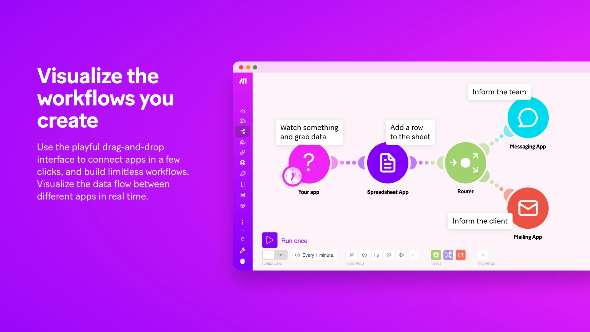 Make is a visual platform that lets you design, build, and automate anything – from simple tasks to complex workflows — in minutes. With Make, you can send information between MailerLite and thousands of apps to automate your email marketing. It’s fast and easy to use, visually intuitive, and it requires zero coding expertise.