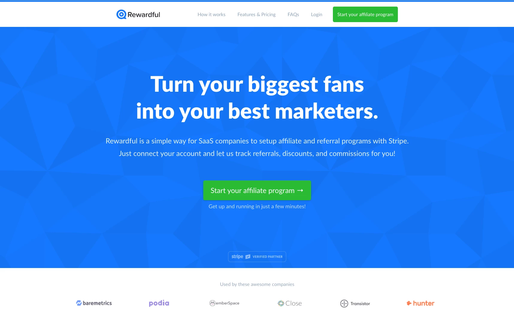 With Rewardful, you can set up affiliate, referral, and partner programs using Stripe as the payment processor. This platform tracks your referrals, discounts, and all of the commissions so you don’t have to do it yourself. Your commissions can be percentage-based, fixed-amount, recurring, one-time, and limited.