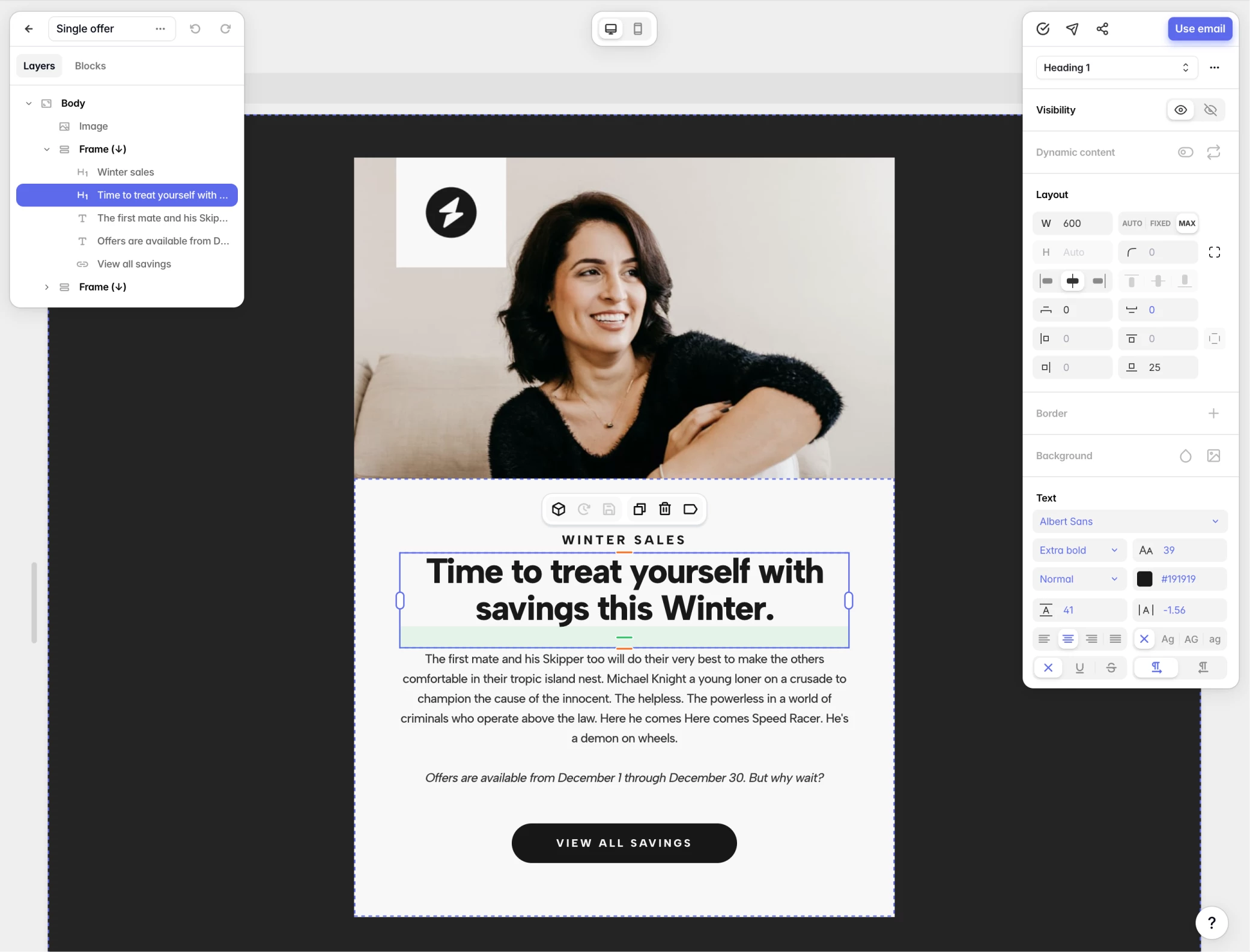 Library of high-quality email templates Tabular’s email templates are your shortcut to great design, if you require some inspiration. Our intuitive drag-and-drop email editor makes it easy for you to customize an email template until you get exactly the design you want.