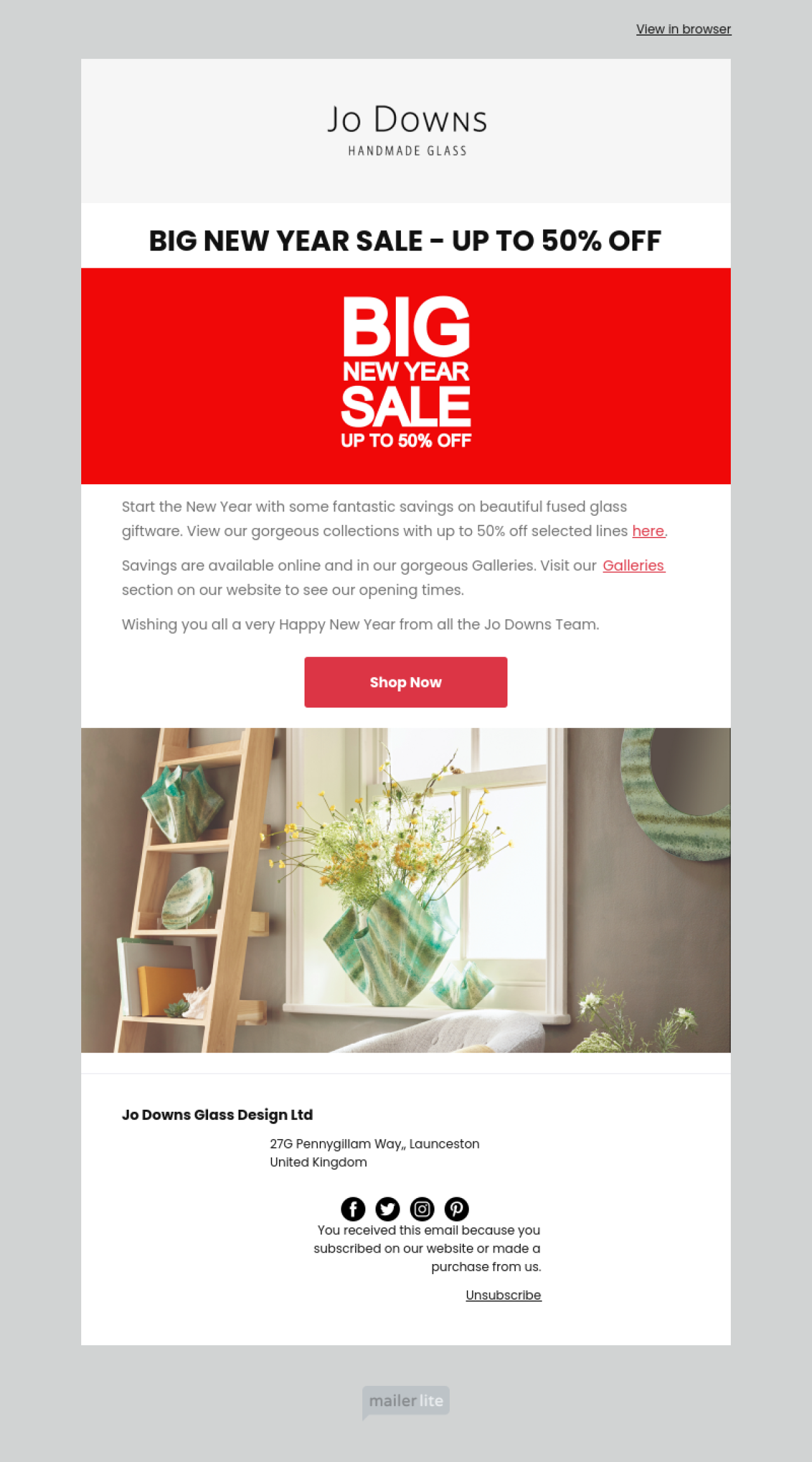 Jo Downs Glass Design Ltd - New Year example - Made with MailerLite