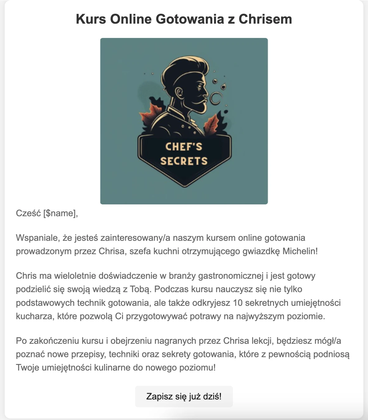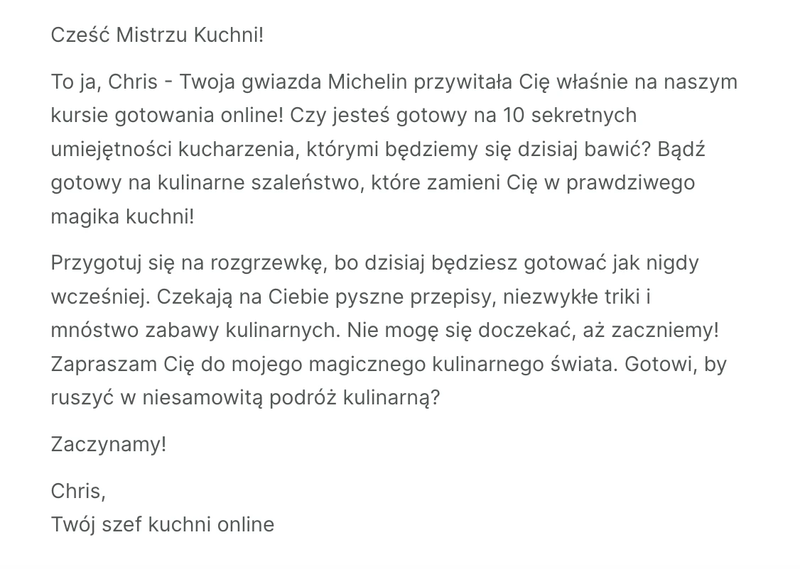Dodaj więcej tekstu w treści e-mail. Zachęć do udziału w kursie, wspomnij o wieloletnim doświadczeniu Chrisa, napisz, jaką wiedzę można zdobyć po kursie i obejrzeniu wideo: m.in. poznać nowe przepisy, techniki i sekrety gotowania.