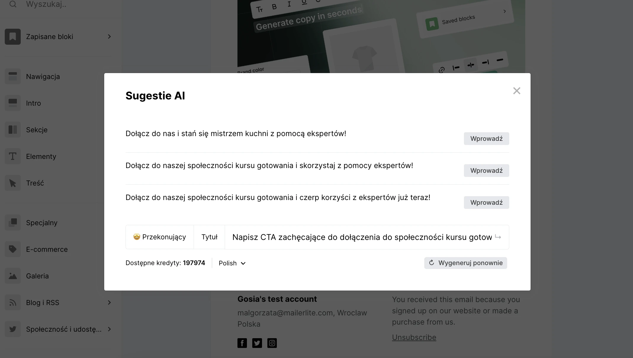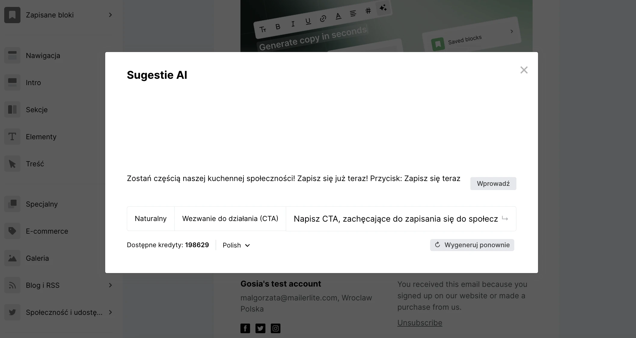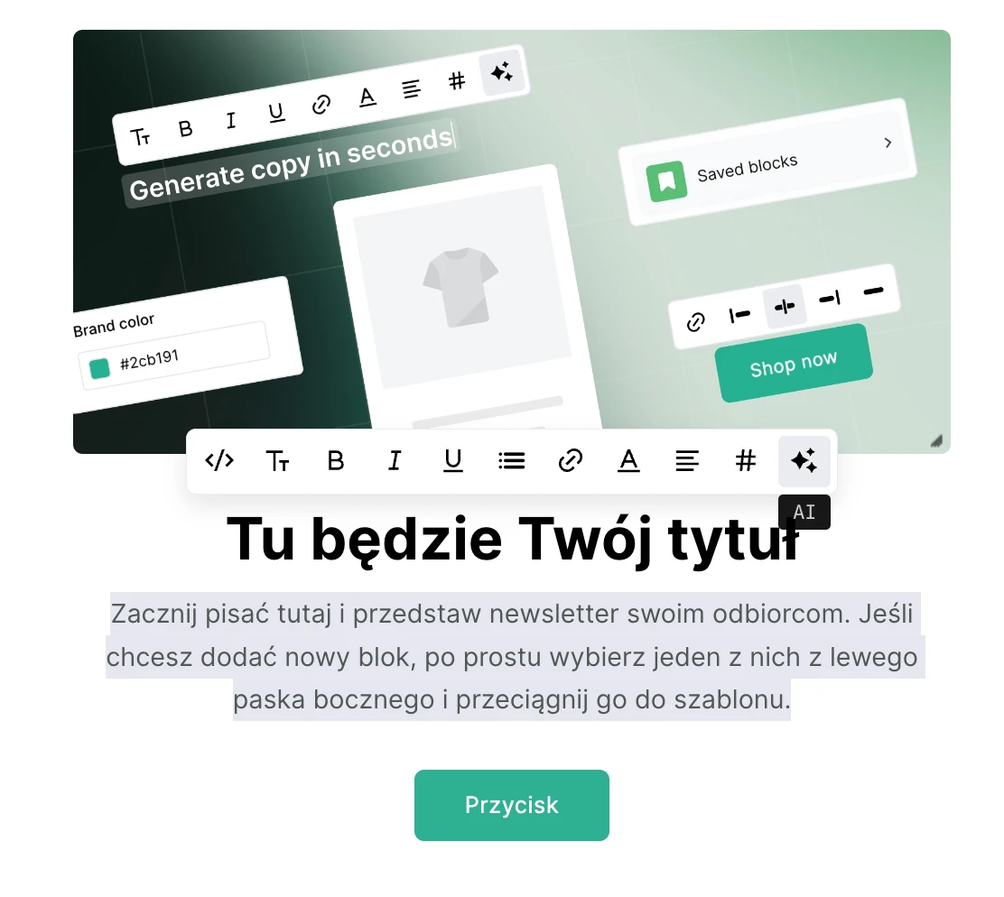 Użytkownicy i użytkowniczki MailerLite mogą łatwo generować treści e-maili oparte na sztucznej inteligencji za pomocą naszego niedawno odświeżonego Edytora drag & drop.