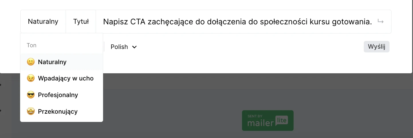 Tworząc alternatywne wersje swoich CTA, możesz także eksperymentować z jego tonem. Chcesz, aby było ono naturalne, chwytliwe, profesjonalne czy przekonujące? Wybierz jedną z opcji w rozwijanym menu.