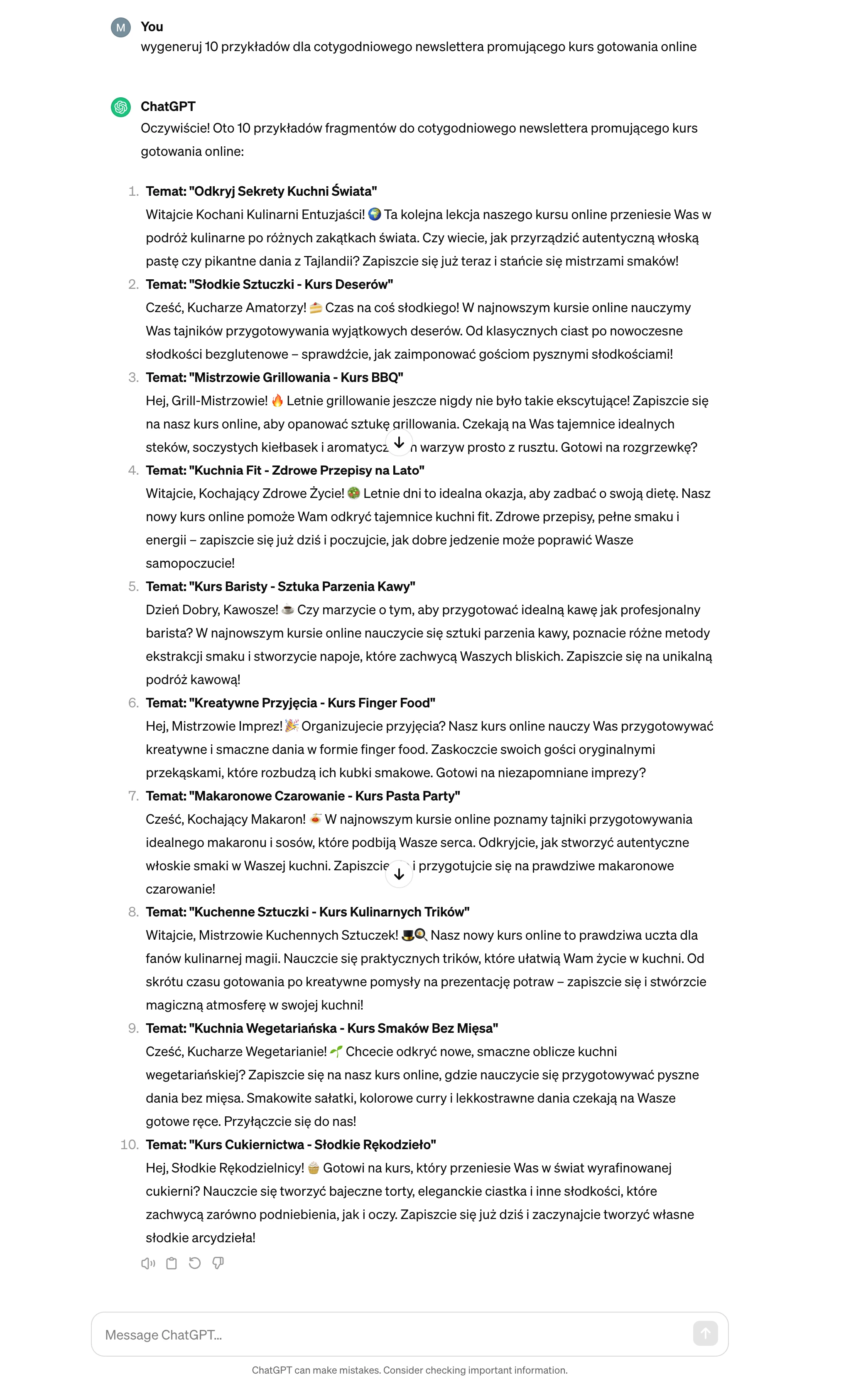 Skorzystaj ze sztucznej inteligencji, aby wypełnić Twój kalendarz newsletterów, które pokochają Twoi odbiorcy. Poprosiliśmy ChatGPT o 10 pomysłów na cotygodniowe maile promocyjne dla naszego fikcyjnego kursu gotowania online. Narzędzie zaproponowało wiele interesujących pomysłów na kampanie.