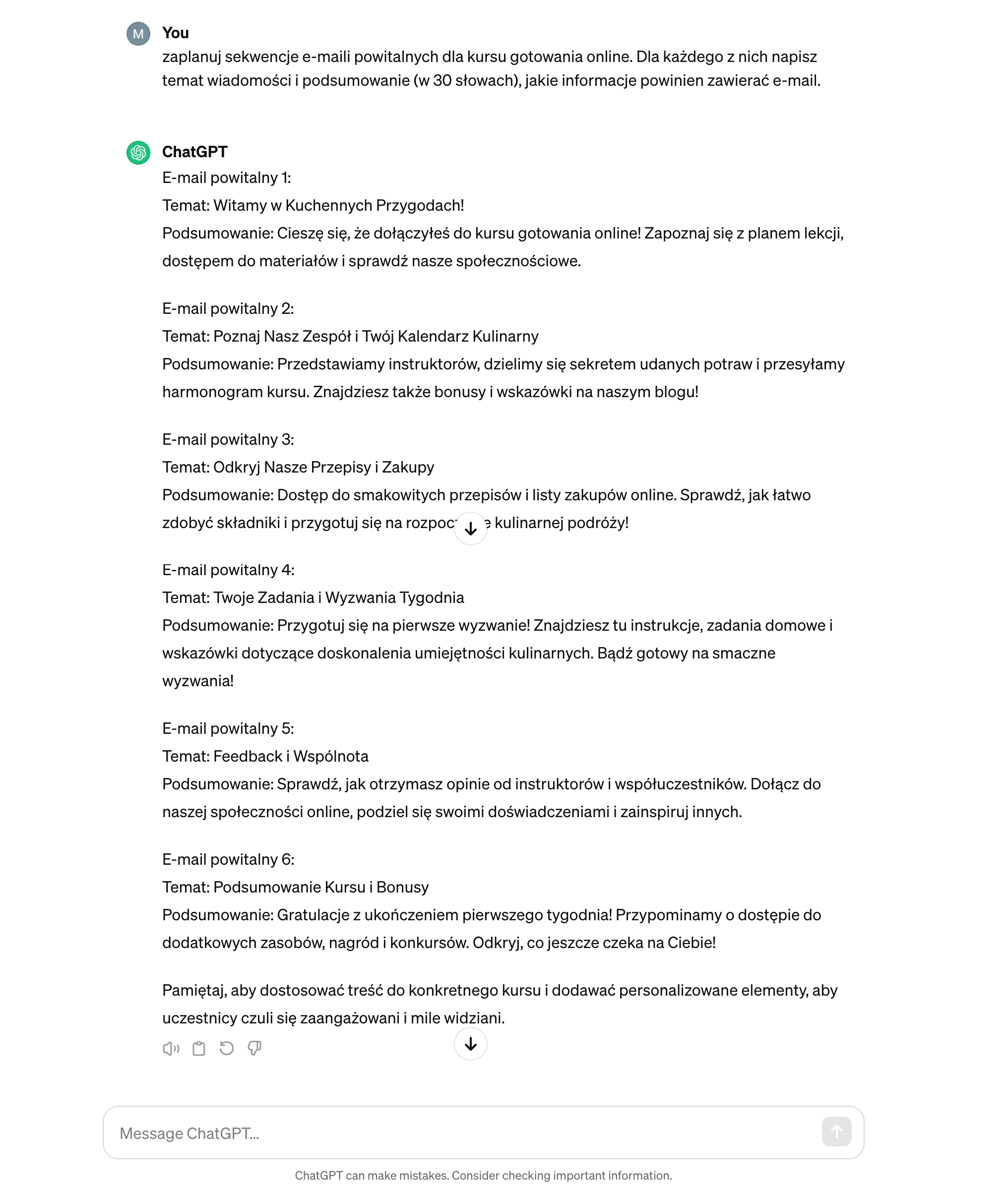 Poprosiliśmy o pomysły na sekwencję powitalnych e-maili. Narzędzie zaproponowało 6-etapową serię automatyzacji e-mail marketingu, która zawiera wszystkie informacje, których nowy kursant powinien się dowiedzieć po zapisaniu się na kurs gotowania.