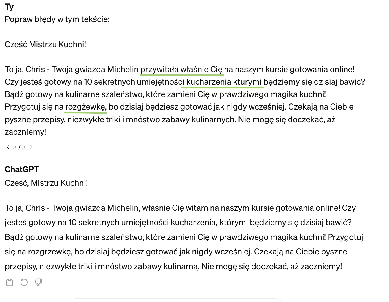 Wygenerowaliśmy tekst dla drugiego e-maila w sekwencji i dodaliśmy kilka błędów. ChatGPT wykrył i naprawił każdy z nich. Narzędzie było nawet w stanie zmienić kolejność "przywitała właśnie Cię" na "właśnie Cię przywitała", pomimo że nie było to błędem ortograficznym. Warto jednak sprawdzić tekst jeszcze raz, ponieważ w przypadku języka polskiego algorytm nie zawsze poprawnie odmienia wyrazy (np. mnóstwo zabawy kulinarną).