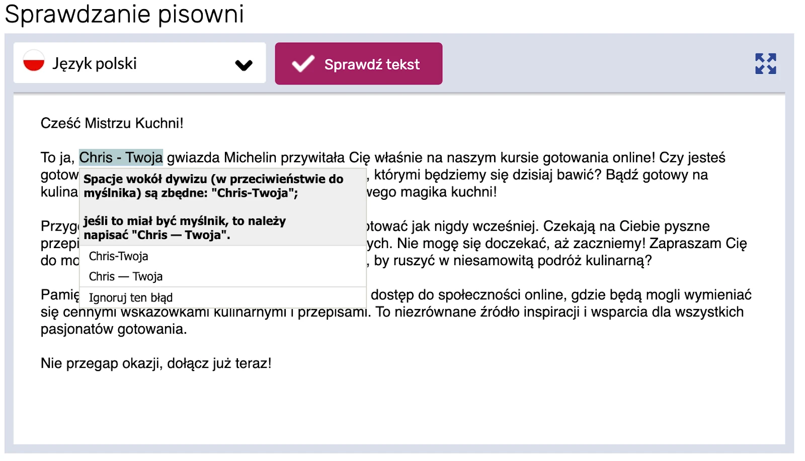 Narzędzie sprawdza Twój tekst pod kątem błędów ortograficznych i gramatycznych, a także proponuje alternatywy wraz z wyjaśnieniami.