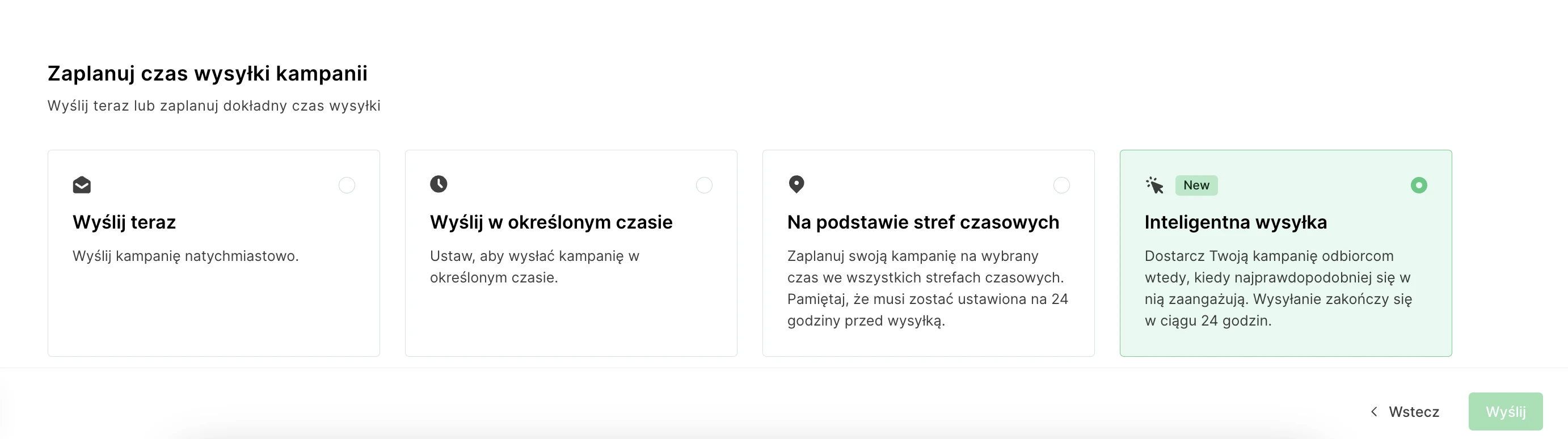 Możesz następnie zdecydować: zaplanować wysyłkę kampanii czy rozpocząć wysyłkę natychmiast. Inteligentna wysyłka dobierze optymalny czas i wyśle Twój e-mail w ciągu najbliższych 24 godzinach.