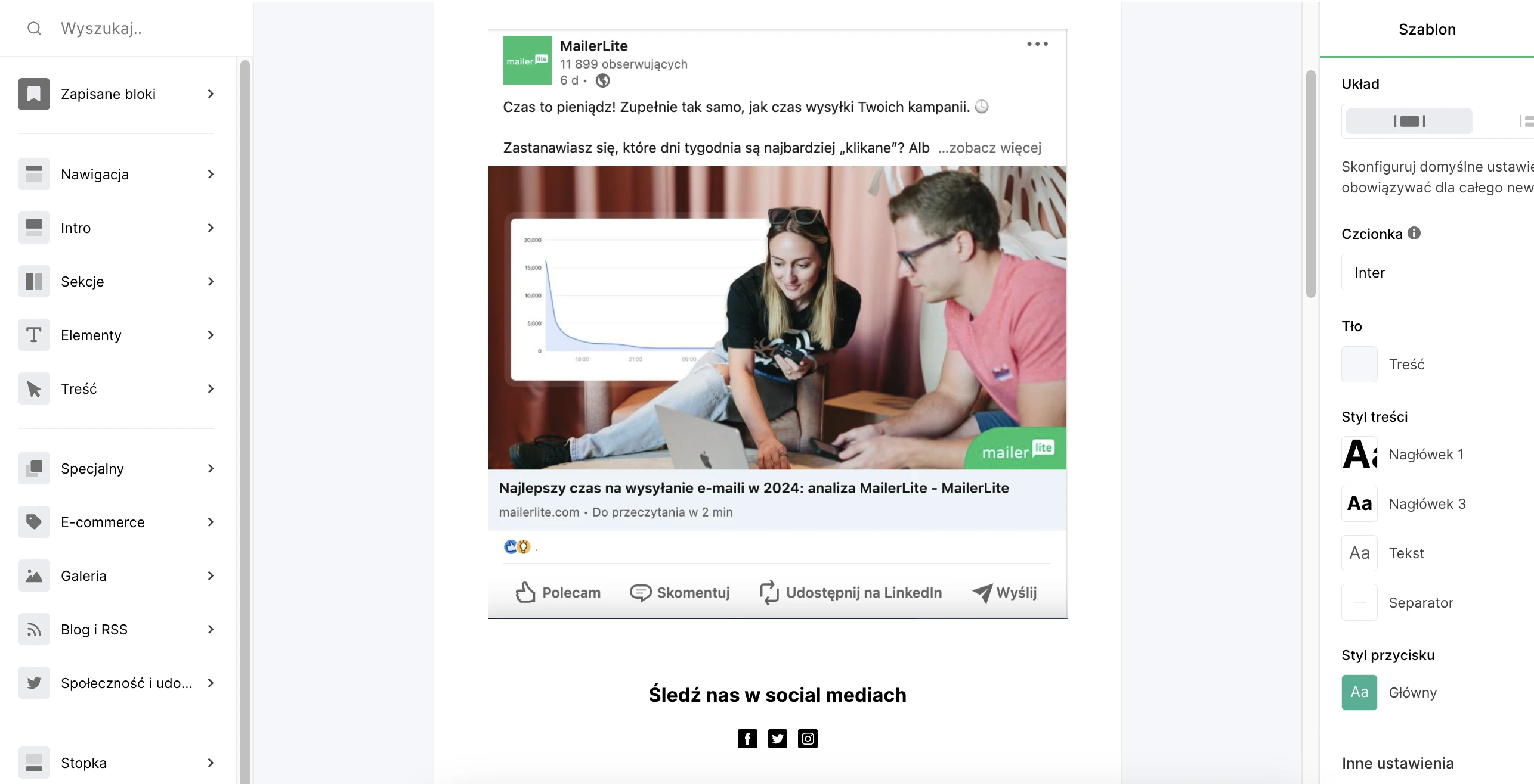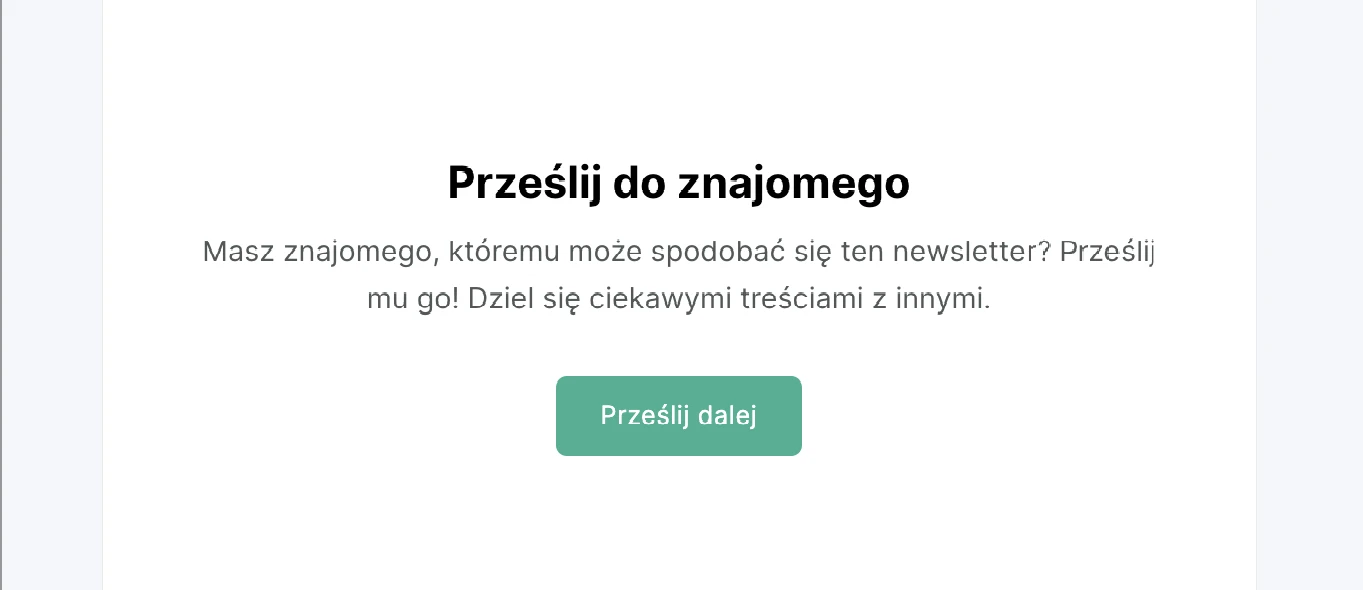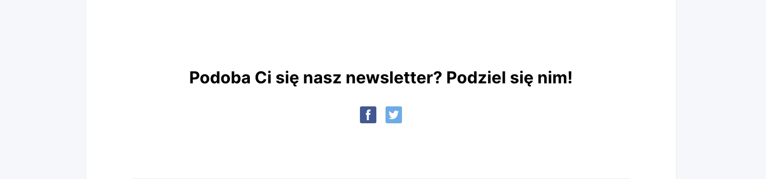 Inny sposób na skuteczne połączenie mediów społecznościowych i e-maili to dodanie przycisków udostępniania w mediach społecznościowych do swojego newslettera. Te przyciski pozwalają subskrybentom i subskrybentkom udostępniać Twoje treści w swoich mediach społecznościowych, rozszerzając tym samym zasięgi Twojego newslettera.