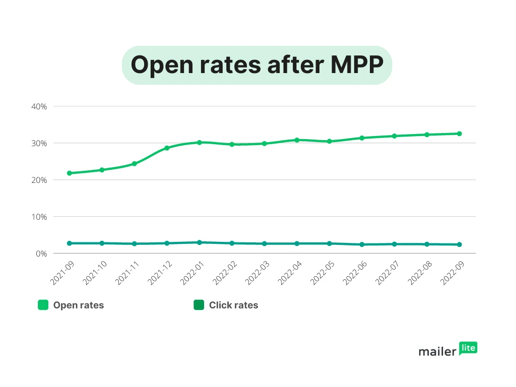 Na podstawie danych z MailerLite, wskaźnik otwarć w e-mail marketingu systematycznie rósł w miarę aktualizacji Apple iOS. Ochrona prywatności Apple Mail nie wpływa na zachowanie subskrybentów i subskrybentek, więc wskaźnik kliknięć pozostały stabilne. Wskaźniki kliknięć są więc najlepszym miernikiem sukcesu kampanii e-mail.