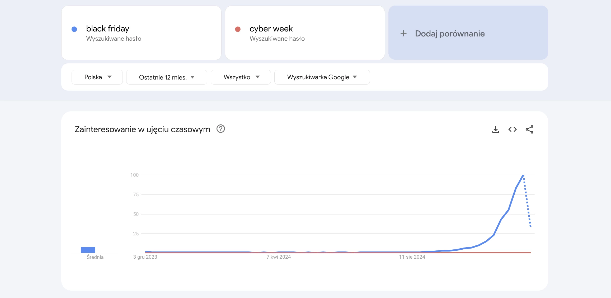 Sprawdź w Google Trends, jakie hasła były najczęściej wyszukiwane w związku z Black Friday. Na podstawie tej wiedzy zdecyduj, czy będziesz np. reklamować się hasłem “Black Friday”, czy “Cyber Week”. Raport wskaże Ci również, kiedy najczęściej wzrasta zainteresowanie tym tematem i pozwoli Ci być gotowym na pierwszych klientów.