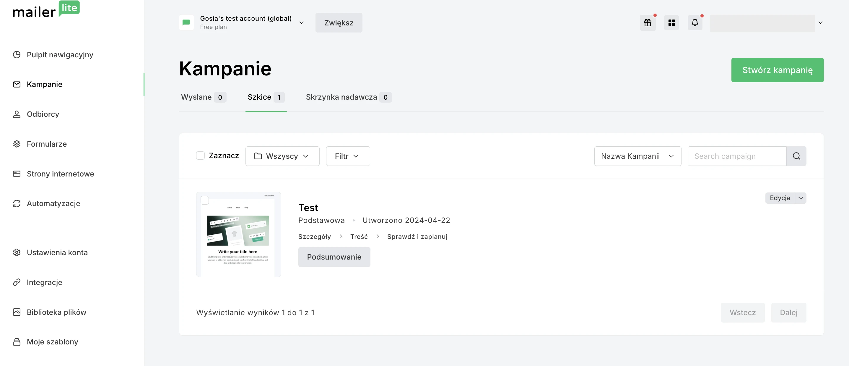 Bezpłatnie do 500 odbiorców z limitem wysyłania 12 000 e-maili miesięcznie