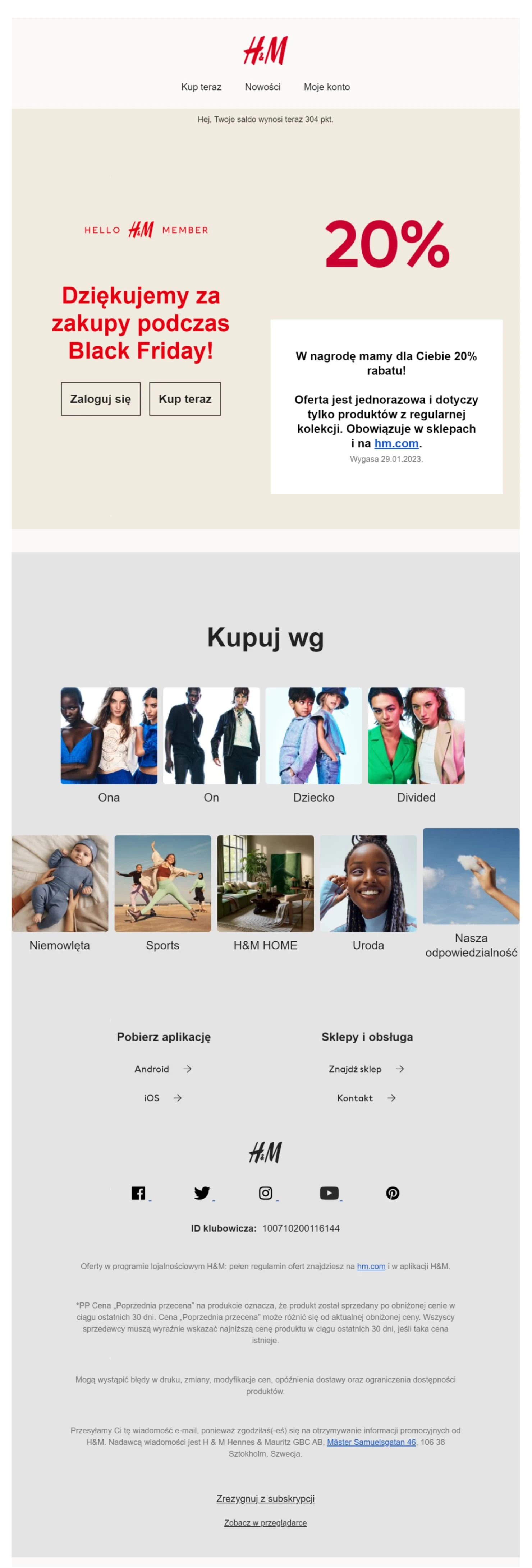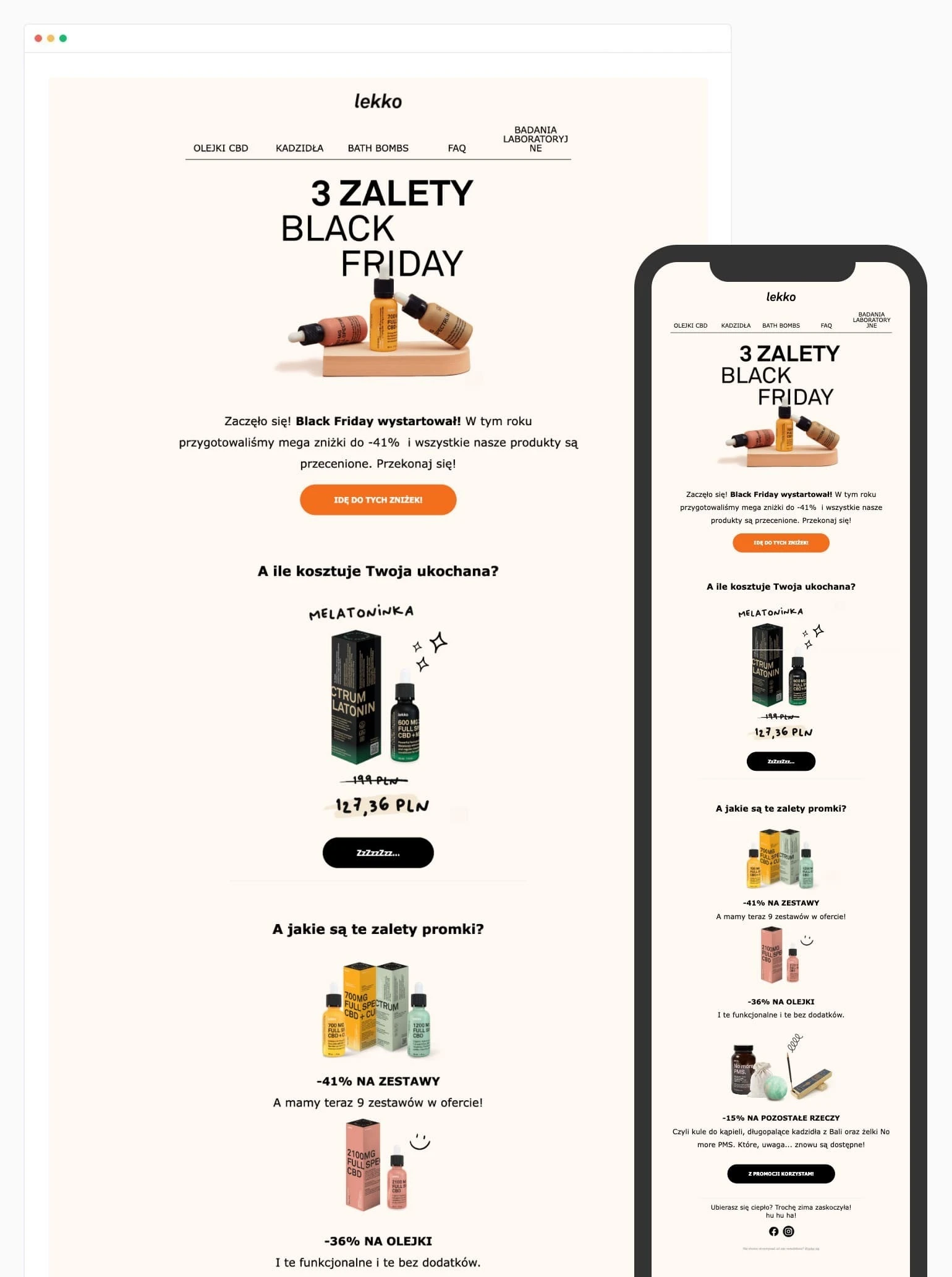 Duże zdjęcie jednego z produktów, opatrzone linkami do najważniejszych kategorii w sklepie, daje odbiorcom szansę na zakupy już teraz – bo są tacy, którzy nie chcą czekać!